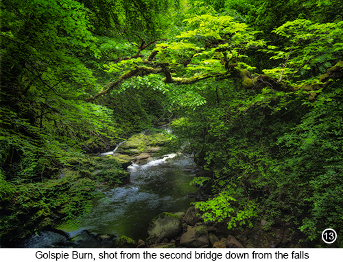 Then, once you finished shooting the "Big Burn Falls". If you set off walking down the path through the gorge, heading back towards the main car park (where your vehicle has now been parked by your partner). You will then come back to the same wooden bridge, you crossed over previously on your way up to the falls. So cross back over the bridge and continue walking along the bottom of the gorge, for a few hundreds yards more. Until you come to the second wooden bridge down from the falls. Which is where I took SHOT 13 of the Golspie Burn, as shown above. There was nothing too fancy going on for SHOT 13. As all I did when I got there, was to lean over the side of the bridge a little. Before grabbing this hand held shot of the scene, using my 24-105 zoom, before quickly moving on, looking for my next opportunity. Yep sometimes, a shot that you are really happy with, really can come this easily. Although mostly not. But every now and then, it's just a matter of being there, seeing a composition and firing off a few shots of it. Before walking on by and looking for more.  |