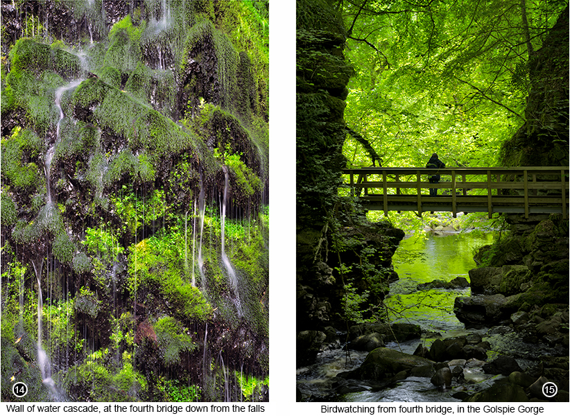 I then continued walking down through the gorge, to the fourth wooden bridge from the falls and where I took another couple of shots, as shown in SHOTS 14 and 15 above. But this time using my tripod etc. Where SHOT 14 is of a water cascade, that flows down the wall of the gorge at this point. To show you the type of fauna, that this continually dripping water supports. SHOT 15, is of my wife looking for birds in the canopy and hoping for another glimpse, of the Spotted Flycatcher she'd just been watching. But is also a shot, that shows you the narrowness of the gorge at this point and the type of wooden bridges you will be crossing over, as you photograph your way through the Golspie Gorge.  |
