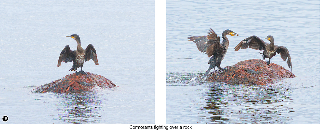 Brora and the Cormorants: Once you have finished photographing the Golspie Gorge, if you return to your vehicle and get back on the A9, still heading North for another six miles. The next village you will arrive at, is called Brora and is where I grabbed a couple of 'action' shots of Cormorants, fighting over a rock in the bay. As shown in the two image composite SHOT 16 above. Now as I have mentioned before, in several other chapters on this site, I am not a wildlife photographer and never will be. So I never go out, with the intention of looking for or shooting wild animals. But as these cormorants, were just sitting there waiting to be photographed, only a short distance from the upper shoreline edge and such an obvious and easy target to shoot. I thought why the heck not and how it could even seem rude of me, not to grab a couple of shots of them and so here they are. So continue driving through the village of Brora, until you come to a dip in the road, with a turn to your right called Harbour Road and turn right here, Street View, Map View. You will then go under a bridge and around to the back of the village, where you will find a large parking area next to the sea, Street View, Map View and park here. It seems that Cormorants love to sit on rocks, that rise up just above the water, to dry out and spend time preening and re-oiling their feathers. Which as there are a lot of rocks in this bay, right next to the car park. Dozens of cormorants are attracted here. However as most of these rocks become fully submerged as the tide rises, the cormorants are forced to use rocks, that are closer and closer in towards the land.  |