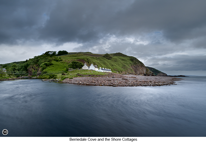 Berridale Cove: then having shot the cormorants at Brora. If you get back on the A9 and drive North for another 18 miles or so. Until you come to a very steep part of the road, with the tiny village of Berriedale hidden away down at the bottom of it. Now look for a turn off on your right called Mill Road, which is where we are going to be shooting next. But don't drive in here, just keep going a little further, Street View, Map View. You are now going to be working in a very sleepy, hidden away, chocolate box pretty coastal village, as shown in SHOTS 17 and 18 above. That not many people seem to know about, or have photographed before. So I think we all need to be mindful of this fact and try to cause as little disturbance down here as we can. Because I know what will happen, if too many people start to crowd into this village at the same time. And that is, the estate owner will put a sign up next to the A9 Mill Road turn off, saying how this is now a private road, that can only be accessed by residents. Believe me, I know how easily this can happen and have in fact seen it happen before. As too many small, "off the beaten track" locations in Scotland, have already done just that. In an attempt to stop the NC500 visitors and campervanners, taking over their pretty little villages. So treat this location with respect and go here alone (if possible) and be as unobtrusive as you can. So that the residents don't get spooked, by the occasional photographer wandering through their tiny village. Or have chance to realise, how they are living, in a potential photographic honey pot location. In other words, if we abuse it, we lose it...  |
