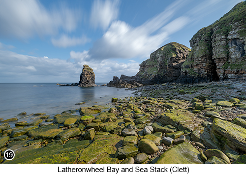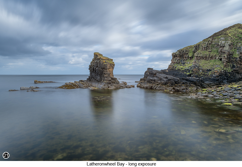 I then moved back up onto the cobbled area of the harbour and setup my tripod on the front edge of it, just to the right of a small boat crane. Where I then took a shorter exposure shot of the scene for the sky and a longer exposure shot for the sea. Which I then blended back together in Photoshop, to create a "time bracketed" view of the scene. As shown above in SHOT 18. There are lots of photo opportunities in the cove at Berriesdale, even though it is just so ridiculously tiny. But once you are there and can see the potential of the place, I know you will want to spend several hours (and several visits) down here with your camera. Tip: "Time Bracketing" is just like exposure bracketing (and can even include an element of both), except you have to do it manually yourself and use a tripod. Where I wanted the sea in SHOT 18, to be flattened out a little and with much less detail, but not look like an ice skating rink, as I did for SHOT 17. But at the same time, I also wanted the sky to remain highly detailed, as well as looking dark and moody. So I setup my camera's focus point, depth of field and exposure time etc, manually. To grab a shot of the scene, with a 1/100th of a second exposure for the sky. Where the clouds then looked slightly underexposed, but not moving. I then threw on a 3 stop ND filter and without changing any of the settings, other than the length of the exposure time to 5 seconds and bumping up my ISO a bit. I took a second shot for the water. It was then a relatively simple process, to combine the elements I wanted from both shots, into one. As the camera hadn't moved between each frame and so nothing other than the length of exposure time had changed. Latheronwheel Sea stack (The Clett): next I am going to take you to a place called Latheronwheel, as shown in SHOTS 19, 20 and 21 above. Which is yet another tiny hidden away location, that just oozes photographic potential. But this time, there are no houses or residents in this bay to disturb and the parking here is both free and unlimited. Which means we can spend as long as we like here, shooting every aspect of this location. And, unless you are really unlucky, you will probably have the place mostly to yourself and what a fantastic location for photography it is. It is said in historical documents, dating from the late thirteenth century, that the name "Latheronwheel", was derived from its original Gaelic name of, "Làthair Ròin". Which translates into English as, "The Resort of the Seals". Which fits in neatly with the fact, that even to this day, this area of the South Sutherland coastline, is home to a large number of seal colonies. Which you will probably see some of them when you are here, corking and napping, a little further out into the Latheronwheel Bay. The name "Clett", which is given to the sea stack, next to the Latheronwheel harbour. Is thought to have been derived from the Gaelic word of "Cleit", meaning rock, or large rocky outcrop, Which in turn was itself derived, from the even older Norse word of "Klettr", meaning a rock, or cliff'.  |