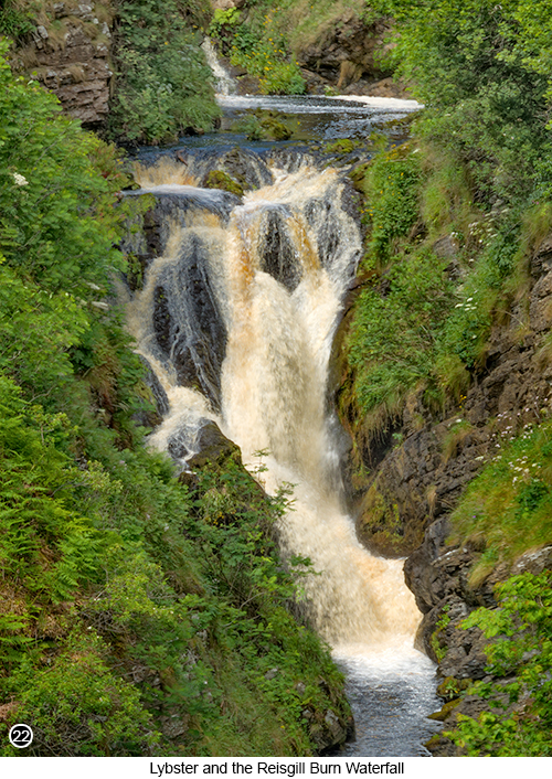 But before you drive all the way down into Lybster harbour, you will first come to an old stone bridge, with the pretty "Reisgill Burn Waterfall", flowing through a deep gorge to the right of it, as shown in SHOT 22 above. The name Reisgill, being derived from an old Norse word, meaning "Brushwood Ravine" But unfortunately, there is nowhere to park near to the bridge overlooking the falls. So drive down into the harbour and park there, then walk back up to the bridge, to shoot the falls. But be aware, this is still a fully working fishing harbour, where fisherman land their catch daily and which is then hauled away by large refrigerated trucks. So you need to make sure you do not block access, to where the fishermen are landing their catch, or to where the trucks need to drive in and out, of this tiny little harbour. So park with care. Then after shooting the falls, continue down the road all the way to the harbour, to a view of its old, tiny and very photogenic Lybster lighthouse, as shown above in SHOT 23 and below in SHOT 24, Street View, Map View.  |
