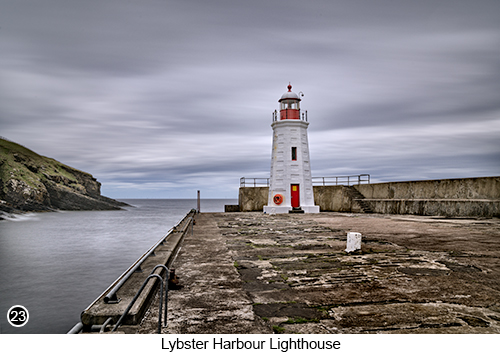For SHOT 19, I walked back up from the car park and over the old stone bridge to the left and over to the other side of the burn. Where I then followed the path, down past the old ruined croft house, before setting up at the back centre edge of the beach. I particularly liked this view and framing of the sea stack, because it allowed me to place it near to a compositional third. As well as to highlight, the bright green colour of the seaweed covered rocks and use the bay itself, as a sort of mirrored "C" curve, that leads the viewers eye through the shot and all the way out to the Clett Sea stack The second view of the sea stack, shown in SHOT 20 above. Was taken handheld, after a heavy downpour had just passed through, as I walked out to the very end of the harbour wall. SHOT 21, was taken from the side of my vehicle, using my tripod and a 10 stop ND - in fact if I am not mistaken, I think I was drinking a cup of tea as I took it. Lybster Harbour Lighthouse: then having finished at Latheronwheel, get back onto the A9 and continue heading North for another 5 miles, until the main A9 road turns off at a junction to your left and the road you are now driving on, becomes the A99. So keep to the right and heading North, along the side of the coast on the A99, for another 6 miles or so. Until you eventually come to a tiny village on your right called Lybster, Street View, Map View. So take this right hand turn and drive down through the village, firstly along Village Road and then Main Road. Until you see a sign pointing to the right for the harbour and take this turn, Street View, Map View.  |