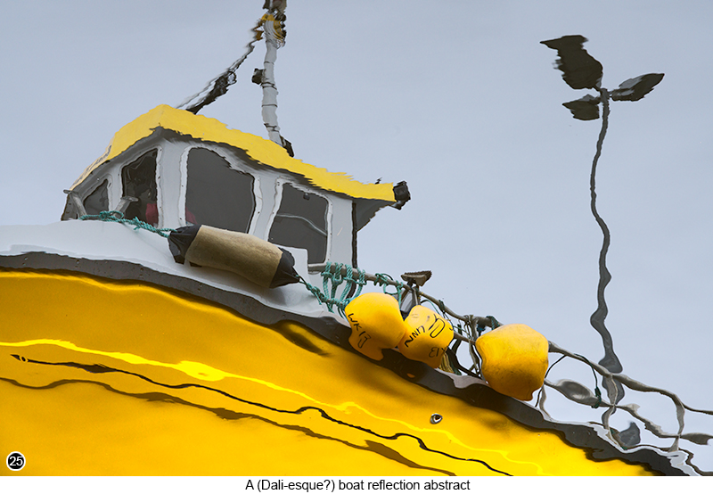 Then, after shooting the Lybster lighthouse from various angles. I decided to have a wander around the back of the harbour and up to the flat bridge near to the top of it and where the Reisgill Burn flows under it. When out of the corner of my eye, I spotted this bright yellow fishing boat, as shown in SHOT 25 below. Which was moored next to the harbour wall below me and how its reflection, was rippling and moving around, in a very appealing abstract way. So I grabbed a few handheld shots of it and then moved on, without giving it a second thought. Then when I got home and started to work on the file. I thought well, as it's an abstract and so doesn't really have any connection with reality. I should flip it back the right way up and then flip it again horizontally, to remove the mirror effect. From what is essentially, a picture of wavy water and this is the result, as shown below. Now I am not saying SHOT 25 is in anyway a great work of art, it isn't. It's just a fun image that I really enjoyed taking. As I strolled around the back end of the old Lybster harbour, where no one normally goes. And isn't that what photography is all about, having fun and looking for shots, where most people would least expect to find them?  |