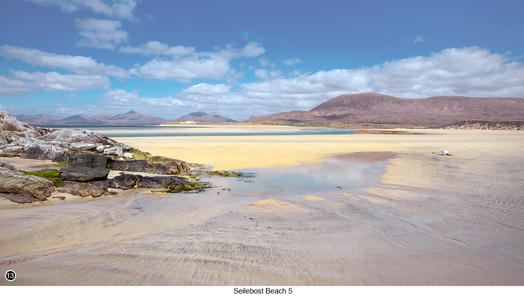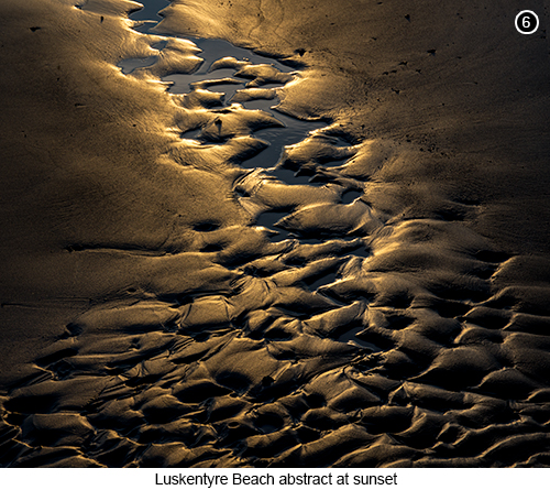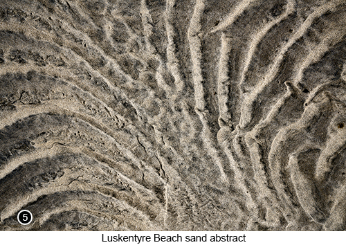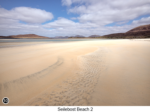 back of the boat, as well as in an almost horizontal plane. So if it is a bright sunny day, then you will have no problem achieving these settings. But on overcast days with less light, you will just have to bump up your ISO to overcome this. Then once on the Isle of Harris and coming out from the ferry terminal at Tarbet, drive up onto the A859 and turn left, heading towards Roghadal. As you now head towards the Luskentyre and Seilebost beach areas of Harris, 10 miles further on. And prepare yourself to start uttering words like "Wow" and "OMG", a lot, Map View, Street view The journey from the ferry terminal at Tarbet on Harris, to the Luskentyre beach area, is around 25 miles, that takes around 25 minutes to complete. Then as you drive over the top of a rock and boulder strewn hill, then down the hill towards Luskentyre. You will now be able to see, the wide flat beach area (at low tide of course) in the far distance and the jaw dropping photographic potential of the area. You will then arrive at the single track, Luskentyre beach road on your right, Map view, Street view. So turn right here and drive along this unnamed road, for another mile and a half, until you reach a grass covered car parking area on your left, with enough space for around 4 vehicles, right at the side of the beach, Map view, Street view. At low tide if you go down onto the beach here (with your 24-105mm lens mounted), you will find lots of abstract opportunities around to your right next to some rocks, of the various random patterns in the two tone colours of the sand, that the outgoing tide will have left on the beach, as shown in SHOTS 5 and 6 below.  |