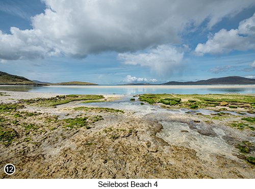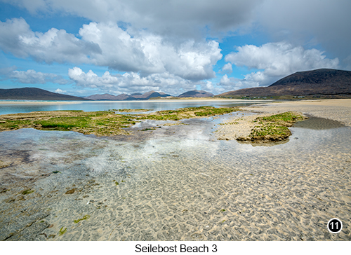 Obviously this draining out process continues unabated, until the whole of the basin is back to open sand, as can be seen to be happening in SHOT 8 above. So the timing for this part of your shoot, is absolutely critical. As this point of maximum reflection, due to shallow depth of the water still remaining in the basin, only lasts for about 10 minutes. But when it is at its peak, it looks absolutely stunning. So I do advise that you make the effort to be here at just the right time, because it really is worth it. And even if you don't manage to get any useable shots of it for some reason, then it is still definitely worth being here just to witness it happening. I also had the luxury of having brought two cameras with me. So for this part of the shoot, as shown in SHOTS 7 and 8 above. I set one up on the tripod with my 70/200, at the top of this grassy bank. Then stood at the side of it hand holding my second camera, so I could shoot the scene quickly, both long and wide at the same time. Then having got your shots of this large reflective pool effect, get back into your vehicle and return to the main A859 and turn right heading North. Until just around the next right handed bend, you will see a single track road turn off on your right, signposted for the Seilebost School. So turn right here and drive to the end of this track, which will then lead you to the Seilebost Beach public parking area. Map view, Street view. It doesn't tell you on any of the road signs, what you should expect to find down this single track road, other than the entrance to the school. Even though it does  |