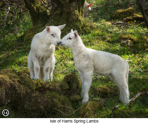 But what makes the Isles of Harris and Lewis even more interesting, is that not that many people seem to come here to photograph them. Yes I am sure you will have probably heard of Luskentyre Beach before, when surfing the net looking for new locations to go to, which is probably how you found this web site. But I also bet that the Luskentyre and Seilebost Beach areas on the Isle of Harris, have never been part of your top photographic locations "to do" bucket list. But they should be. So having now shot this area of Luskentyre, go back to your vehicle and then drive back up and out onto the A859 and turn right, Map view, Street view. As I now take you deeper into the islands, to yet more gob smacking locations. Tip: it might be worth mentioning at this point, that if you can time it to be here during the last week of April. Then you will also have the chance to see and photograph. "fresh out of the oven", wobbly legged, newborn baby lambs, frolicking and boinging around everywhere in front of you, as shown in SHOT 14 to the left. You will see them running around in the fields, in people's gardens, on the beach and even jumping around spring like on the roads directly in front of you and then running off to their moms to comfort suckle, as soon as they realise you are there. So if you think you might enjoy being surrounded, by cuteness in every direction and spending lots of your time saying things like, "oh good grief, that one must only be a few minutes old and so sweet I just want to hug it". Then try to time your visit here for the last week of April. Where as well as the abundance of spring lambs absolutely everywhere, you will find that both of the islands are still pretty much void of tourists. To read Part 2 of this photographic tour around the Isles of Harris and Lewis, click on the link below. Or if you wish to read my original guide, which describes the entire Outer Hebridean archipelago from top to bottom, click here.  |