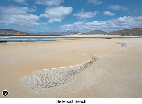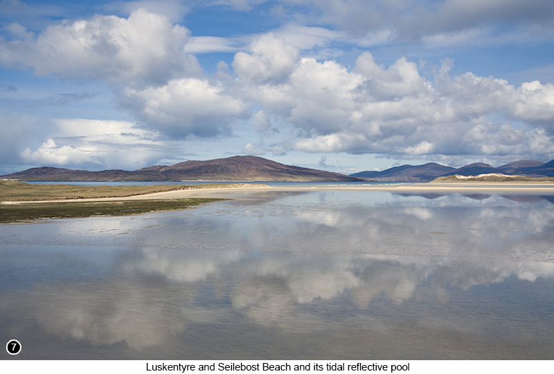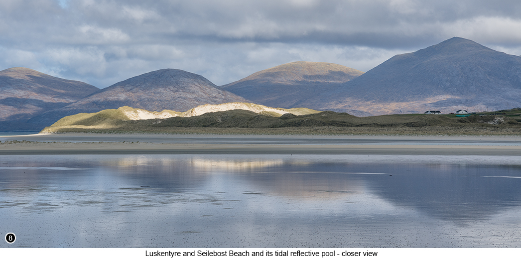 To get the best shots of this view, of the Luskentyre/Seilebost beach area with its tidal pool, as shown in SHOT 7 above, you need to be here about 2 to 3 hours after the highest point of the tide. As the whole of the Luskentyre sea basin area, will have had chance to almost but not quite, drain back out into the sea, through a small deep channel on the opposite shoreline. Which is where you were just shooting your sand abstracts, like the one shown in SHOT 5 above and is what helps to create these weird patterns. So if you have timed it correctly, you will now see that the whole of this large, flat foreshore basin area, will have slowly draining out, to the point where it is down to only a few inches deep. As such, the whole of this basin will momentarily, turn into a gigantic reflective pool, that I know you will really want to photograph. This reflective process, also seems to occur even if it is a windy day. Which must be due to the shallow depth of the water at this point and how it is still being drawn quickly back out into the sea.  |