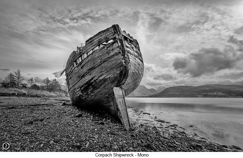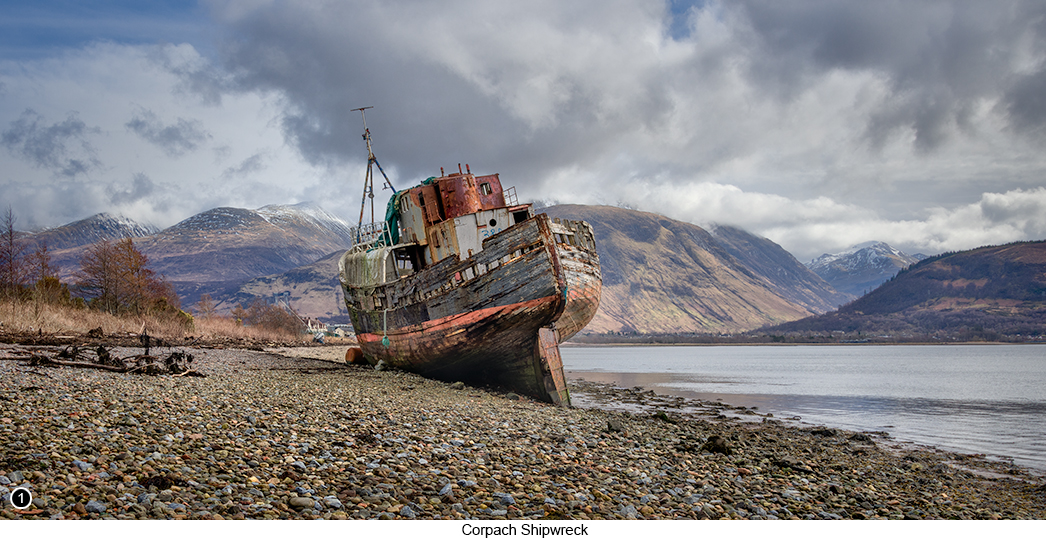 And of course they found her, because by this time with the entire clan, having now worked itself up into such a high pitched frenzy, meant that any older lady, who happened to be living in the area and not a member of the clan would do. But just before the baying, pitch fork carrying mob turned up at her house, she heard them crashing through the woods as they came for her and knew what was about to happen next, so managed to escape out of the back door. But she also knew, that the baying mob would soon track her down if she stayed on the path, so she ran into the river, hoping it would throw them off her scent. But still they kept coming and getting ever closer. Until finally, she arrived at the top of the Eas Chia-Aig falls, just as the mob burst out of the forest behind her and where she then threw herself down onto the rocks, before sliding lifelessly into falls and disappearing beneath its dark pool of water, never to be seen again. Later there was a poem written about the "Caoineachag" (Gaelic for Weeper). Which describes how from that day forth, a loud, continuous, blood curdling wail of distress may be heard, by anyone venturing to near to the falls. Which would indicate there would soon be a death, or a catastrophe within the clan. And which it is said, that this blood curdling wail, was indeed heard by several members of the clan, on the night before the battle of Culloden and where most of the men of the Clan Cameron, were then wiped out. You may have actually seen these falls before, as they were featured in the 1995 blockbuster movie about Rob Roy (staring Liam Neeson). To be used as the backdrop location, for one of Rob Roy's many fabled escapes from the Red Coats. By him leaping out from from the rocks and into the Witch's Cauldron, to then disappear under the water. If when you are finished shooting the Witch's Cauldron waterfall and to get back onto your route, heading up towards the Isle of Skye and the North West of Scotland. If you retrace your steps back down the B8005 the way you came in, until you once again reach the turn off to the B8004, as it heads backs towards the Pepper Pot Lighthouse. Then turn left here to get back onto the B8004. Then continue on all the way to the end of this road and where you will then arrive at the very impressive Marine Monument and the main A82 road. So turn left here, to continue your drive further North.Tip: How to use your wide angle lens more effectively. I see lots of online landscape photographers and vloggers etc., informing their viewers, on what they think is the best use of their wide angle lenses. Which is to capture large, wide open vistas and especially receding waves on the beach and seascapes. And there is nothing wrong with that, as it is a great idea and a good use of your wide angle lens. But what they rarely seem to discuss, is how wide angle lenses can perhaps be even more useful and allow you to get in really close to your subject, but still keep it comfortably within the frame. Yet knowing this simple fact, means you can easily utilise this 'close in' effect to your advantage, to create even more dramatic views of a subject, that you would not normally be able to capture with any other lens. As shown in the two close up shots of the Corpach Shipwreck, in SHOTS 2 and 4 above. So my tip to you is this: don't just think of your wide angle lens as a one trick pony, that is only any good for capturing all those super wide vistas, that seem to go on for ever and out to infinity. But think of it more as a close up lens, that will allow you to get in really tight to your subject, to make it look huge, detailed and dominant in the foreground. Yet still wide enough to capture enough of the background, to fully frame and balance out your subject within its surroundings. |