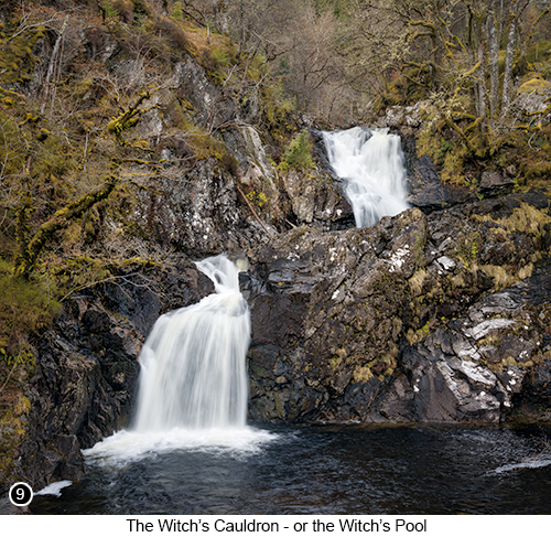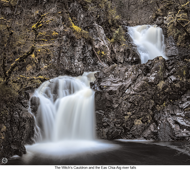 The view shown on the right in SHOT 9, shows the falls in its normal mid level flow. But on our second visit to this area a few weeks later, after several days of heavy rain. The flow was much more substantial, as can be seen in SHOT 10 below. So my tip for getting the best shots of the Witch's Caldron and the Eas Chia-Aig river waterfall, is to try to be here after several days of heavy rain if you can. And as we are talking about Scotland, then that is pretty much most times of the year. So having now parked your vehicle, walk over to the bridge and set up your tripod about a third of the way onto it from your right. This way you will have a good wide view of the falls, while at the same time, avoiding most of the clutter of tree branches that surround it and that will try their damndest, to creep into the edges of your shot. In SHOT 9, I went for my preferred shutter speed of 1/5th (or 1/8th) of a second, that I like to use if I can, because I think it makes moving water look at its most painterly. But on our second visit to the Witch's Cauldron and with much more water flowing over the falls. I decided to go for a 30 second exposure, using my 10 stop ND, because why not? Now I know some photographers like long exposure moving water shots and some prefer them to be taken with much faster shutter speeds. So here you have both and which should hopefully satisfy both of these preferred styles of working. The legend of the Eas Chia Aig Falls and why it is more commonly known as the "Witch's Cauldron", or the "Witch's Pool". Dates back many, many hundred of years, to when this area was still under the strict control of the men of the Clan Cameron. Who back in those days, were said to be one of the wealthiest clans in the land and where the wealth of a clan, was measured by the large number of cattle that they owned. Then one day, a mysterious illness appeared in the cattle and began to sweep through the herd and kill them in large numbers. The clans folk were mystified, as there didn't seem to be anything wrong with the cattle, when they were checked. Yet the following day any number of them would be dead, but with no marks or an apparent cause. |
