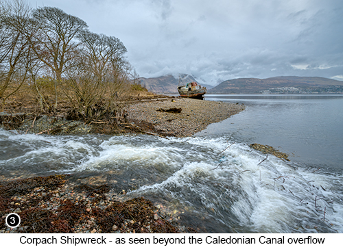 So park wherever you can and grab your gear (your wide angle and mid range zoom) and set off walking, towards the Caledonian Canal, now directly in front of you. Then as you reach the canal, walk across one of the several canal lock bridges you will see in front of you, to get onto a path that then leads up to your left, on the opposite side of the canal and that follows along the side of Loch Eil. Then a couple of hundred yards further up the path, you will come to another path, that cuts through the straggly trees next to the loch on your right, just before a small bridge that goes over the canal overflow area. So take this path through the trees and then walk down to the pebbly beach. You will now see the wooden wreck of the Golden Harvest to your left and just beyond the outflow from the canal, as shown in SHOT3 to the right. Now even though this is the first shot of the wreck that I took on this day, I did not choose to put it at the top of the page, because I don't think it is a good enough shot, to be the first view of the wreck that I wanted to show you. Because to be honest, this view of the wreck from this particular viewpoint, is not (in my humble opinion) the best vantage point from which to shoot it. As the trees immediately to the left of the canal overflow, look very straggly and not very pretty to me and the pebbled beach in the near foreground, has lots of thick, ugly wire netting running through it. So the shot on the right, is more of a record shot to show you the scene when you arrive here, rather than something I would ever want to hang on my wall. But who knows, you might get something better from this viewpoint. Although I did go back a few weeks later, to shoot the old wreck from this very same viewpoint, using my 70/200. But alas, still to no avail. |