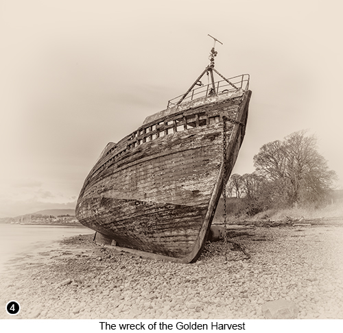 So working my way in towards the wreck and shooting it from every angle I could think of, as I moved in closer with each shot. I finally realised, that the best view I could get of it (again in my humble opinion), was not by using my medium 24-105mm zoom, as I was using for SHOTS 1 and 3. But to get in as close as I could and shoot it wide, with my 16-35mm, which I did for SHOT 2 - see the Tip at the bottom of this page. Now you may think differently of course and prefer to shoot it using a long lens, to compress in all the detail behind the wreck. As well as to increase the apparent height of the Nevis mountain range, by pulling the peaks forward into the scene. Which I agree would look really good, on a crystal clear day with Ben Nevis, covered in fresh snow in the background. But alas the scene wasn't giving me anything like that when I was there and the sky was mainly dominated by a series of low, fast moving clouds and flat light. With the occasional bit if sun breaking through, surrounded by the odd patch of blue sky. So sucking it up and working with what I was being given, I just carried on and did my best. And after all, isn't that what landscape photography is all about? Trying to make sweet tasting lemonade, when all you are being given is lemons? I then moved passed the shipwreck and around to the front of it, to shoot it from what I thought would be a fairly unique angle. That I don't think most landscape photographers visiting this scene, would normally think to shoot it from. You see this way, shooting the wreck from the front, means you don't get the mountains, or anything else of any interest in the background. Yet this image shown here in SHOT 4, turned out to be the only one from this location, that I would quite happily have hanging on my wall - yes I know, landscape photography is a funny old game isn't it? If you think this image on the left reminds you of anything, or a style of work that you might have seen before? Then go onto Google and search for the work of 'Frank Meadow Suttcliffe', where you will instantly recognise where I got the influence, that helped me to create this image. |