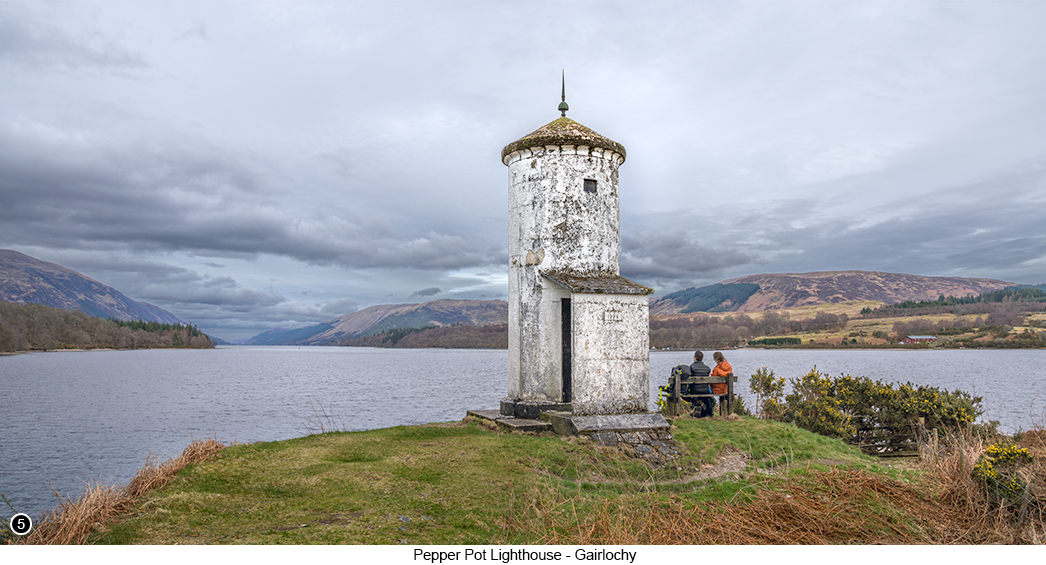 So moving on to the next location and the tiny, picturesque Pepper Pot Lighthouse at Gairlochy and the view down the Great Glen of Scotland. As shown in SHOT 5 below. From Corpach and the shipwreck of the Golden Harvest, drive back up out of the car park and rejoin the A830 by turning right, as if you were heading back towards Fort William. But then, shortly after entering the tiny village of Banavie, you will see a turn on your left, signposted for the B8004 road and Gairlochy 6 miles further on. Take this left turn, Street View, Map View. Then continue on this small single width B8004 road for four more miles, until you reach a fork in the road, with the B8004 continuing on down to your right and the B8005 heading to your left, take to the right fork and continue on down the B8004, Street View, Map View. | |