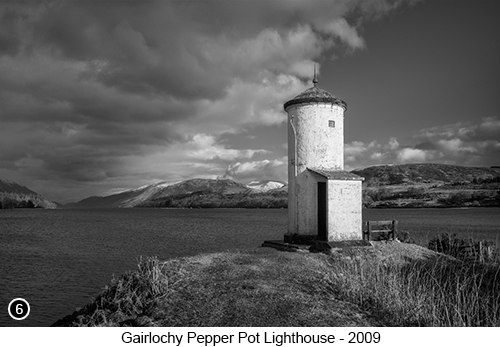 There are in fact three Pepper Pot Lighthouse situated along the Caledonian Canal. The one shown above at Gairlochy, another one at Corpach and also one at Fort Augusta. These tiny lighthouses are also known to be, the smallest ever built in the UK. Yet oddly enough, though they were only in the early 1900's, no one really knows much about them, or what their purpose was. Other than they were built, at the same time the canal was constructed. But it is known, they were used to guide American mine laying ships, up and down the canal during world war one and then again during world war two. The view of the Pepper Pot Lighthouse shown in SHOT 5 above, was taken in 2024. Whereas the black and white version of the same scene, shown in SHOT 6 to the right, I took back in 2009. Where the only obvious difference, is that the paint on the lighthouse from 15 years ago, looks a lot more recent and fresh, than it does in the shot shown above. So if anyone from the Caledonian Canal authorities is reading this? Then I think it's about time you guys, gave these historically interesting and very photogenic miniature lighthouses, a fresh lick of paint. Don't you? Then once having taken your shots of the lighthouse and the Great Glen view. Make your way back to your vehicle, then turn around and drive back up the B8004 the way you came in. But this time just after the bridge, hang a right at the junction with the B8005, Street View, Map View. |