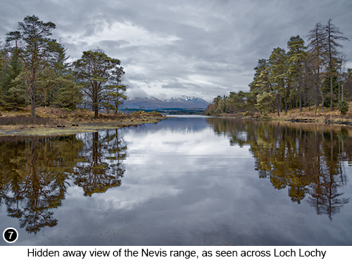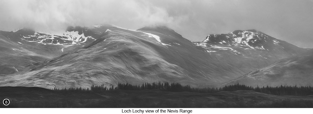 However, if the fence has indeed been rebuilt when you are here, then worry not, as there is a gate a little further up the hill to your left, that will allow you to get down to the side of the loch and to where I took this shot. But be aware, because it is very, very muddy down here next to the loch, especially after heavy rain. So if you do intend to grab your version of this shot, as shown to the left in SHOT 7. Then I would suggest that you put your wellies on first. The image below is also of the Nevis Range from across Lochy, but taken using my 70/200 and from a little further up the road, to your right. There are lots of different angles of view you can shoot in this location from, especially on a calm day with reflections. So do scout around to see what you can find. You may look at SHOT 8 below and think, hey Dave, that shot looks quite heavily processed and you would be right. Because it is the result of me just twiddling around in Photoshop, when I had nothing else better to do and trying out various filters and blend modes and then pushing sliders around etc. You know the type of thing that we all do, when we have some spare time on the computer and an image that just isn't jumping off the screen, in a way that we would like it to? So you start to throw all your post processing tricks at it, just to see if anything sticks. So please don't ask me to explain what I did to SHOT 8, to get the effect that you now see below. As it really was just me 'twiddling' about and experimenting, to see what, if anything would appear. And other than turning it into a black and white, at the very end of the process. Everything else I did to it, is a blur (no pun intended). |