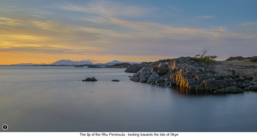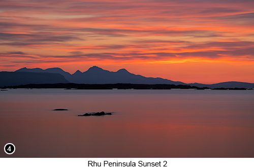 The Rhu peninsula is a relatively small finger of land, that sticks out into Loch Hourn. It is around five miles long, but only two miles wide at its base and which narrows to a point the further you travel along it. This tiny but beautiful peninsula, points out to sea in a West to South Westerly direction (so very good for sunsets at any time of year) and looks out towards a long line of dramatically shaped islands, that stretch almost entirely across the horizon in front of it. The Rhu Peninsula also lies very close to the tiny seaside village of Arisaig, with its single cafe, general store, hotel and boatyard and is why we chose to stay in the Arisaig Hotel when we last visited here. We had already stayed in the Hotel about four times over the years and knew it to be a really comfortable place to stay and a great central location to be in, for all the locations that I will now be discussing, throughout this three part Highland and Moray mini photographic tour. So if you do choose to stay at the Arisaig Hotel as I suggest that you do, then I would also highly recommend that you opt for their very tasty full Scottish breakfasts each morning, before you set out hunting for photographs. As you will then no longer feel the need to eat anything else for the rest of the day, until perhaps a light snack in the evening, followed by a dram or two at the bar. |