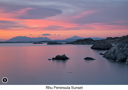 So back on the main A830, continue driving on for another 4.2 miles, until you see a sign pointing you down to the village of Arisaig on your right, but not the first turning down to Arisaig that you are now going to drive past, but the second, Street View, Map View and take this right hand turn. Now continue down the B8008 towards Arisaig (I know, different road entirely to the one just mentioned above, but with the exact same road number - go figure!), until you see a left turn signposted for Rhu 3.5 miles further on, Street View, Map View and turn left here. Now this tiny little winding road, is going to lead you to what I think is one of the best sunset locations to be found anywhere in this area of the North West of Scotland and which is also well off the beaten track and tourist routes. So this hidden away gem of a photo location, is definitely somewhere I know you are going to want to spend a quiet evening or two with your camera, as can be seen in SHOT 2 above and throughout the rest of this chapter. As you drive along this 3.5 mile long road, you will see a variety of photo opportunities along the way, with several tiny lochs and the occasional nicely located single windswept tree, as shown in SHOT 1 above, Street View, Map View. In fact other than a few cyclists and walkers, no one else seems to know about this hidden away gem of a photo location and is definitely somewhere you are going to want to spend some time, enjoying your photography, Street View, Map View. |