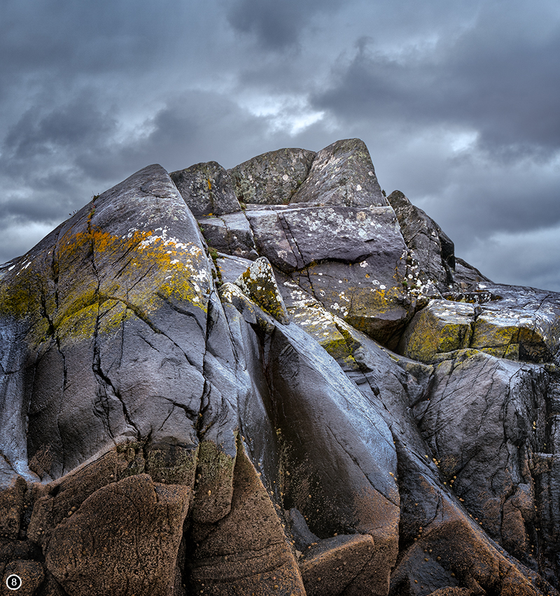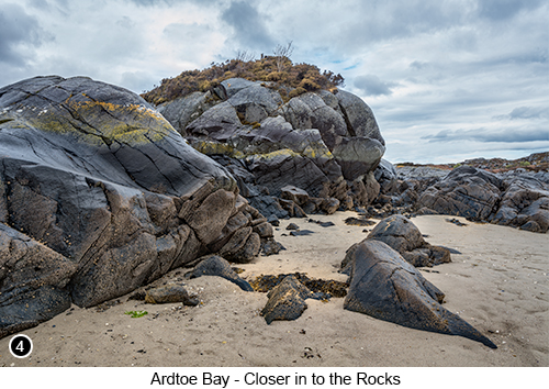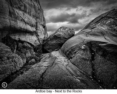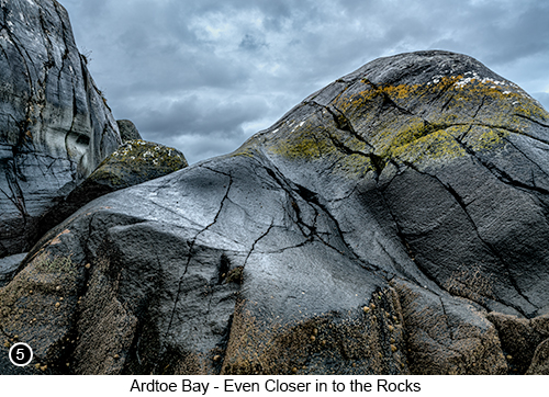 So after taking your initial wider angle pano shots of the beach and rocks, which I suggest you do before walking any further into the bay and putting your own size 12 boot prints into it. You can then start to slowly shoot your way into the scene, grabbing more and more, of those interesting details and shapes as you go, as shown in SHOT 4 to the Right. I then continued to work the area and get ever more excited, about the shapes I was seeing in the rocks and how they had been sculptured, rounded and polished by the last ice age. And how I could use those details and shapes in my compositions, as shown in SHOT 5 below. I then move in even closer to the rocks, looking for colours, tones, cracks and shapes, as well as composing my shots in such a way, that I could capture the moody sky above them. In fact I was really quite lucky, because when I looked up at the sky, it was obvious it was about to start raining any minute, so I knew I had to work quickly. Yet even so, the sun was still shining softly on the front faces of the rocks, allowing me to shoot them front lit, but with lots of nice dark brooding skies above them. I did have to bracket some of these shots, as shown in SHOTS 5 and 6 below. But that is something that is quite an easy thing to do these days, what with so many cameras allowing you set up a bracket sequence, by selecting just one item in the menu. As well the many programs now available, that allow you to seamlessly align then combine, several shots together with different exposure times. |