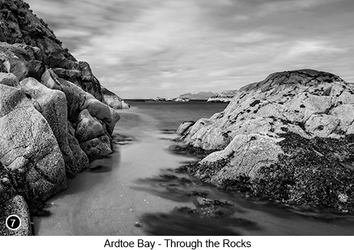 Although I do still tend to do this type of 'Blending' work myself by hand and which I just happen to have explained in great detail, throughout my Landscape Photography Masterclass and Guide Book. But then you already know that don't you, because you bought your copy of it years ago and have studied it to the point, where it is now a bit dog-eared with wear. As well as using it to take you, to all those many hundreds of beautiful photo locations I describe within it. You have haven't you? Then after shooting the main rock structures up close, I looked around and noticed that the tide had now gone out even further. So I began to work my way around to the right of the main area of rocks, as I started to walk out into the sea to the height of my wellies, where I set up to shoot a 30 second exposure, as shown in SHOT 7 below. I really liked this composition, as shown in SHOT 7 below. With its view of the distant mountains through a natural channel in the rocks. That I was using to create a nice leading line into the shot for the viewers eye to follow and where the waves kept on surging through it, swirling the seaweed around to give it some motion. Tip - Shopping for Photographs: Sometimes, and as I have already mentioned above, you arrive at a scene and realise, that you are going to have to shoot your way into it, so that you don't damage the look of it with your own footprints. But I would also argue, that more often than not you will also find, that have to shoot your way into the photograph itself - so what do I mean? |