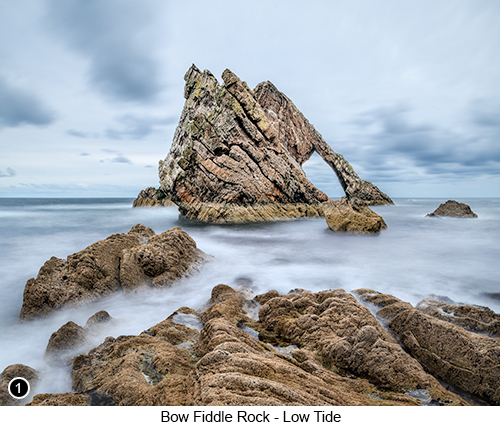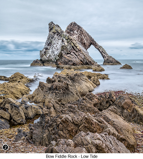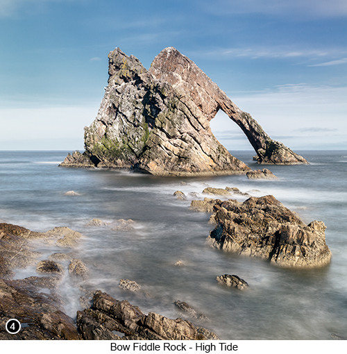 So yes I know, most of you must now be thinking to yourselves that shot THREE was nothing more than a stroke of pure luck, or at worst I am now trying to sell you some sort of unexplainable mumbo jumbo about how I chose to shoot it without thinking. Yet all I can honestly say to you and with my hand placed firmly on my heart, is that this seems to keep happening to me, time after time. So yes if it is nothing more than pure luck, then so be it and I am OK with that and who am I to question it? But perhaps it really might be something deeper and that we all have hidden away within us, if only we are willing enough to allow it to rise to the surface occasionally and take us over for a minute or two, who knows? But what I can tell you and which is something that I am absolutely sure of, is that I am just so happy that it seems to keep happening to me and so all I am suggesting here, is that if you are willing to give this idea a go and concentrate a little less on what you are doing for perhaps one or two of your shots, then it might also start happening to you. So what I ended up doing to get shot THREE as I also began to strip down my kit, was that as I already had my camera setup for a long exposure shots using my 10 stop screw-in ND filter for both of the previous shots, I just lined up the shot to roughly encompass the whole of the scene in front of me and clicked the remote without really looking at what I was capturing. Then when the 30 second shot had finished and the rest of my kit was packed away, I removed the 10 stop ND and lowered the exposure time to 1/13th of a sec. I then locked my remote to on and let the camera fill up its buffer as I packed away the ND filter and just as the rain began to hit me in the face like a hale of tiny wet bullets. I then hurriedly wiped down my camera as best as I could in the circumstances and stuffed it back into my bag and headed back to my vehicle. Then when I was looking at my images back on the computer a few weeks later, I simply blended several of these final shots (including the long exposure shot) back together, using a very simple technique that I have developed for myself over the years and which is fully described at the bottom of page 125 in my book. Shot FOUR above, was taken on a completely different 'blue sky' day at high tide and so I thought I would throw this image into this chapter, just so you know what Bow Fiddle Rock looks like at hide tide - oh and I almost forgot to mention, that because Bow Fiddle Rock is located on the East coast of Scotland, it is also a very good location for a dawn shoot. So if you want to get really serious and have a go at shooting the Bow Fiddle Rock with the sun rising up in the centre of the hole in the arch, then you will need to be here either at the end of May or towards the end of the second week in August and at around 03:30 to 04:00 in the morning, if you also want to catch the best predawn light. |