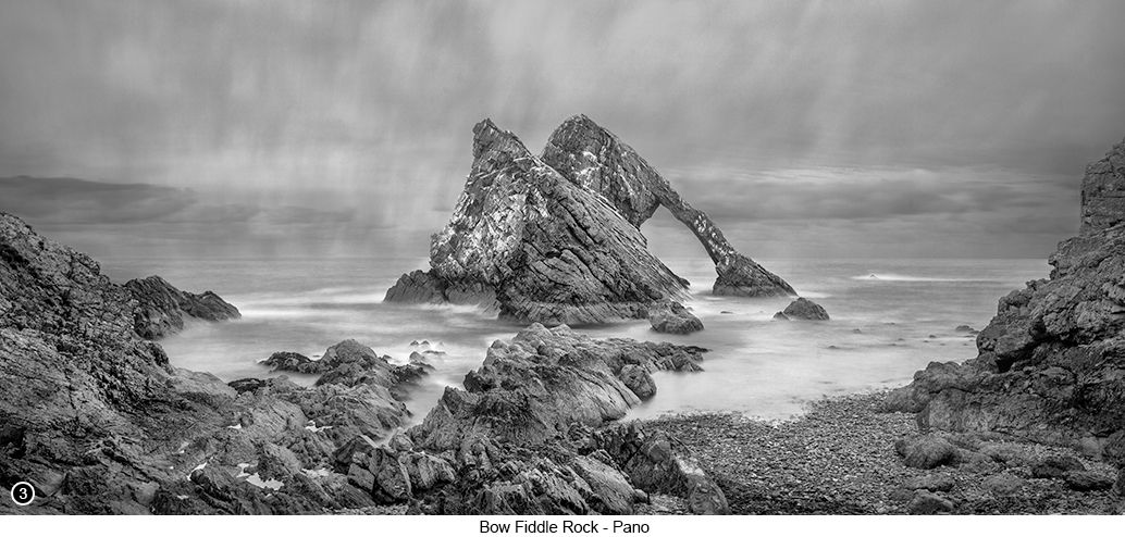 So here is what I did to shoot the first three shots shown above and which were all shot within an hour of each other on the same day: When I arrived at Bow Fiddle Rock, I could see that the tide was almost fully out. So I worked my way down to the edge of the water to the right of the bay and as close to the main rock structure as I could get on the pebbled beach and setup there. But this wasn't giving me anything like what I wanted, so I walked over to the left side of the scene and then wobbled my way over the slippery rocks to shoot the scene from there, as shown in shot TWO, which was a little better, but still not quite what I wanted. So I made my way back around to the front of the central rocks and clambered up on top of the rocks that lead out towards Bow Fiddle Rock and walked out as close to the rock as I could for shot ONE. I then tried shooting the scene in various formats, as a wide angle shot, then a vertical, then as a stitched pano. But as the tide had now turned and large waves were beginning to crash over the rocks in front of me and splashing me and my gear with seawater, I thought it would be a good time to beat a hasty retreat and wobble my way back onto dry land before I was cut off by the incoming tide - which I nearly was. I then stood back and just admired the scene for a little while, as the clouds started to close in above me and a curtain of rain began to blow across the scene in front of me. So without really thinking about it (and which is a state of mind that often seems to get me the best shots) and just as I was starting to pack away my gear before it got really soaked, I thought I would just take one last wide angle long exposure shot, just to show you the reader what the whole of the Bow Fiddle Rock Bay looked like for context and which got me shot THREE and which then turned out to be the shot I am most chuffed with. So was this last shot of the day as I was packing away my gear, some sort of absent minded accident? Well yes I suppose it was, but I do seem to do this quite often these days and that is to work a scene as hard as I can and in every way that I can think of, but to also occasionally just drop in a shot or two that are not so planned and that I haven't analysed to death before I took them and sure enough, they do occasionally produce something quite startlingly different (and I think shot THREE is a particularly good example of this). Where I end up with a shot that makes me think wow, that's a cracker, even though I took it when the conscious part of my brain wasn't even really thinking about what I was shooting, or hoping to achieve, whereas the subconscious part of my brain that told me to take the shot obviously did. |