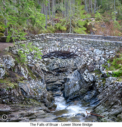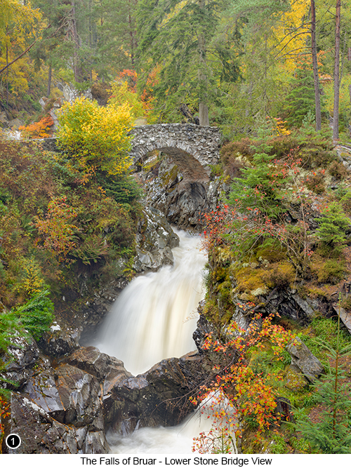 Once you reach the old corrugated roofed building and then walk past it, you will come to the path that leads up to the falls on your left. So walk up the path through the wooded area, for a few hundred yards or so, until you come to the first view of the old bridge, that crosses over the Bruar River at the lower part of the falls. But as you get nearer to this first part of the falls, you will see a large rocky boulder in front of you, that obscures your view of the falls. So continue walking further up the path, for another couple of yards or so and then around the edge of the boulder. Where you will find a small wooden staircase, that lets you climb up onto the top of the boulder and walk over to the mesh fence you will see at the other side of it. Walk towards the fence and set up your kit as close to it as you can, for the shot of the falls and the old bridge, as shown in SHOT 1 above. |