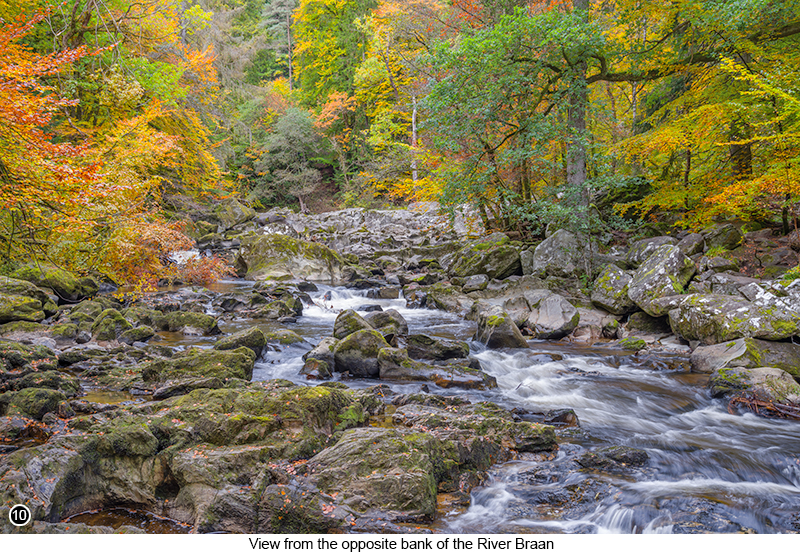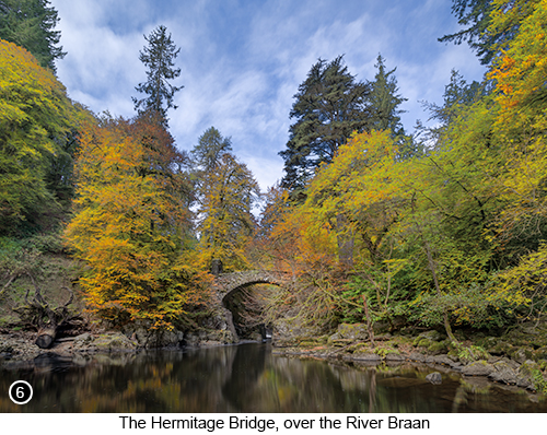 Keep walking up the path alongside the River Braan to your left, for about 3/4 of a mile. Until you see a sharp bend in the river that turns to your right. You will then see a line of trees at the edge of the river, above a steep sided part of the river bank. If you then walk out to the edge of the river bank and look down, you will see there are lots of large rocks and boulders at the edge of the river. You will also see a little to your left. Where there is a rough path that leads down to these rocks and where (if you are careful), you can make your way out to a large flat rock, that sticks out into the river on your right. Which is just about big enough, for a couple of photographers to work from. So carefully make your way down to this large flat rock and set up your tripod there, for a wide angle view of the Hermitage Bridge from below, as shown in SHOT 6 above. Admittedly, there isn't much else to shoot from this viewpoint, other than what you see in SHOT 6. As there isn't that much room to move around, or to frame up a different composition and the view back down the river, isn't really compositionally exciting either. So even though this particular shot, is a bit of a one trick pony, that every photographer visiting this location will take. It is still worth the effort to grab your version of it, because it is certainly an enjoyable and worthwhile shot to take. So think of this as a warm up shot, that will get your creative juices flowing for the rest of the second part of this shoot. Of course you might see something I didn't. But isn't that the name of the game? |