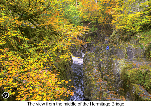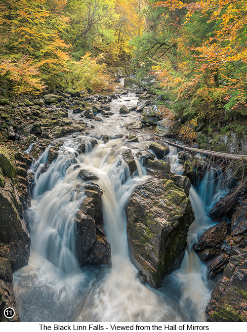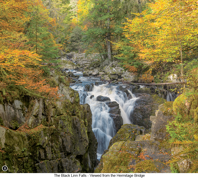 Then having taken your shots of the Hermitage Bridge from this lower viewpoint, get back up onto the path and continue heading up the river and where you will soon come to the entranceway onto the old stone footbridge, as shown in SHOT 7 above. If you are here at a busy time of year, such as I was at the height of autumn, when I took most of these shots of the Hermitage Bridge and Black Linn Falls area. Then it is going to get very busy indeed, especially on this little footbridge. As crowds of people queue up behind you, to take their selfie shots in front of the falls. So setting up your tripod on this narrow footbridge and taking any more than a few minutes to grab your shots, is going to be difficult and probably quite argumentative, to say the least. So walk out onto the bridge and frame up your shot in your mind. Then wait for a gap in foot traffic and setup at your chosen spot, to rapidly capture your preconceived shot. As you keep apologising profusely, to the queue of people that have started to backup behind you. Tip: If people (none photographers) see you using a tripod, they will initially think "Ah", this person is a pro and so they know what they are doing and I am therefore willing to give them a little extra time and consideration to do it. But their willingness to allow you this extra time, will only lasts for a couple of minutes. So don't take longer than that. |