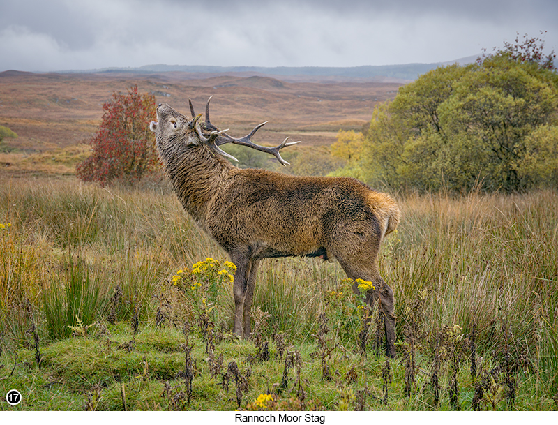 So pull in here, as you try to avoid any obvious muddy bits to get your vehicle's wheels stuck in and then walk the last few yards down to the shoreline. You will then have a wide, 180 degree view of the loch. With great views of the small Prison Tower to your left and the upper part of the loch to your right, as shown in SHOTS 14, 15 and 16 above. The weather when we were there was pretty lousy, as the rain kept crossing the scene in waves and pouring down by the bucket load. But thankfully it wasn't windy, just torrential rain. So having brought my golfing sized umbrella with me, I was still able to continue and setup to take several shots of the views, looking both up and down the loch. In fact to show you how hard the rain was coming down, if you look at SHOT 16 above, you might think it looks like it was misty when I took it. But you would be wrong, as that misty effect was being created, by the amount of water falling out of the sky and then accumulating in the image, over a 30 second exposure. If you then get back into your vehicle and continue driving onto the end of this "No Through Road" and the remote Rannoch Moor train station area. Then spend some time scanning, or walking around the wild moor in front of you. Where you maybe lucky enough to spot and photograph, some of the many wild animals and birds that live here. Such as I was able to do, when I took this shot of a rutting stag, as shown in SHOT 17 below. |