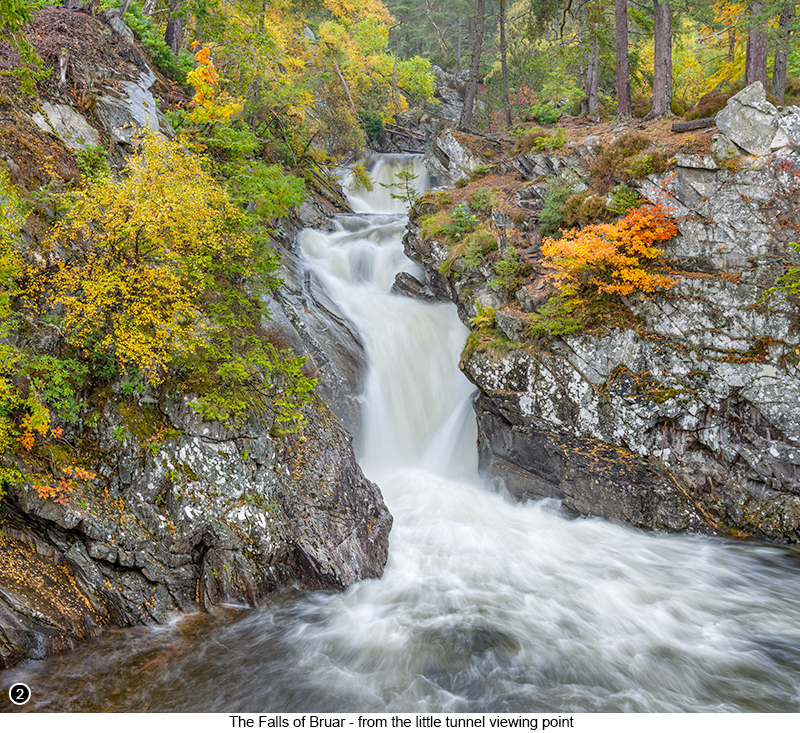 First of all, as I guide you along this two day, three location landscape photographer's tour. I thought we should start at the Falls of Bruar. As this is the first location you will come to, when driving south along the main A9 road, heading towards the town of Pitlochry. But if you are instead heading North along the A9 and driving up from the South of Scotland? Then you will probably want to tackle this route in reverse order. But either way you arrive at these locations, I know you are going to enjoy all of them and the many photographic opportunities you will find there and the chance to grab lots of really good images all along the way. We are then going to walk up to the top of the falls and then all the way back down the other side, in a short circular route. Now even though the Falls of Bruar, are located up the side of a steep hill, where the path is sharply inclined in places, as it follows tightly along the side of the river. It is still none the less, quite an easy route to fully complete. Especially if you wish to get all the way up to the higher part of the falls and the second stone bridge. As you will find yourself stopping continuously, to take lots of photographs all along this trail. Which should allow you to repeatedly catch your breath at each composition. So take your time and pace your ascent, as there are some parts of this walk, that are steep. But thankfully (for older photographers at least), there isn't too many of them. You will also find on the right side of the falls, as you get nearer to the top, how there is a path that leads directly down to a point beneath the upper falls. But at the time of writing (early 2025), this path was closed off, due to some parts of it having crumbled into the river. Yet the sign that had been placed in front of the path, to stop you walking down it, was just a very small 'A' board, that anyone could easily step around or over and which seemed to me to be very half hearted indeed. So perhaps the path hadn't crumbled away at all and they just wanted to keep people, away from the long drop of the upper falls, for general safety reasons. Or it had indeed fallen away and so it really was dangerous to walk along. Which if true, then they really need to set up a fence, that fully blocks off that part of the trail. Because I know a lot of visitors and landscape photographers, will simply ignore this little sign and carry on past it. And I know you know what I talking about and how all those DANGER signs we see at viewpoints, are never meant to apply to us photographers? Oh no not us, as we are exempt from having to take even the slightest bit of notice of signs such as these, just as long as we think the shot will be worth the risk in the end. But I decided on this occasion, that I would not ignore the DANGER sign and stick to the main path up to the higher falls. Which was seriously annoying, as I was sure there would be some great photo opportunities, shooting from directly beneath the upper part of the falls. But instead I let my conscience get the better of me and walked on by. |