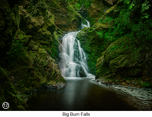 You will probably find that you are mostly going to be alone at the falls, but with the occasional hiker, popping in for a look and to take a quick snap of the falls on their phone. Which you need to be aware of, because there isn't much space on the viewing platform, for more than a couple of people. So you should be ready (and willing) to step aside and temporarily move your camera and tripod out of their way, so they can get their shot of the falls. This is also a good idea for you, to help maintain the quality of your images. As you will be working on a wooden platform, where every time someone moves, it wobbles and vibrates and so will ruin your shots. So I found the best and friendliest way to work around this, was to give them all the space they needed. To allow them do their thing as quickly as possible, as I chit chattered to them, waiting patiently for them to move on. Which they invariably did after only a few minutes. So I could get back to doing what I came here to do and that is to take a sharp, long exposure shot of the "Big Burn Falls", as shown in SHOT 12 above. |
