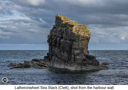 I then moved back up onto the cobbled area of the harbour and setup my tripod on the front edge of it, just to the right of a small boat crane. Where I then took a shorter exposure shot of the scene for the sky and a longer exposure shot for the sea. Which I then blended back together in Photoshop, to create a "time bracketed" view of the scene. As shown above in SHOT 18. There are lots of photo opportunities in the cove at Berriesdale, even though it is just so ridiculously tiny. But once you are there and can see the potential of the place, I know you will want to spend several hours (and several visits) down here with your camera. Tip: "Time Bracketing" is just like exposure bracketing (and can even include an element of both), except you have to do it manually yourself and use a tripod. Where I wanted the sea in SHOT 18, to be flattened out a little and with much less detail, but not look like an ice skating rink, as I did for SHOT 17. But at the same time, I also wanted the sky to remain highly detailed, as well as looking dark and moody. So I setup my camera's focus point, depth of field and exposure time etc, manually. To grab a shot of the scene, with a 1/100th of a second exposure for the sky. Where the clouds then looked slightly underexposed, but not moving. I then threw on a 3 stop ND filter and without changing any of the settings, other than the length of the exposure time to 5 seconds and bumping up my ISO a bit. I took a second shot for the water. It was then a relatively simple process, to combine the elements I wanted from both shots, into one. As the camera hadn't moved between each frame and so nothing other than the length of exposure time had changed. Latheronwheel Sea stack (The Clett): next I am going to take you to a place called Latheronwheel, as shown in SHOTS 19, 20 and 21 above. Which is yet another tiny hidden away location, that just oozes photographic potential. But this time, there are no houses or residents in this bay to disturb and the parking here is both free and unlimited. Which means we can spend as long as we like here, shooting every aspect of this location. And, unless you are really unlucky, you will probably have the place mostly to yourself and what a fantastic location for photography it is. It is said in historical documents, dating from the late thirteenth century, that the name "Latheronwheel", was derived from its original Gaelic name of, "Làthair Ròin". Which translates into English as, "The Resort of the Seals". Which fits in neatly with the fact, that even to this day, this area of the South Sutherland coastline, is home to a large number of seal colonies. Which you will probably see some of them when you are here, corking and napping, a little further out into the Latheronwheel Bay. The name "Clett", which is given to the sea stack, next to the Latheronwheel harbour. Is thought to have been derived from the Gaelic word of "Cleit", meaning rock, or large rocky outcrop, Which in turn was itself derived, from the even older Norse word of "Klettr", meaning a rock, or cliff'. |