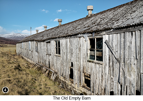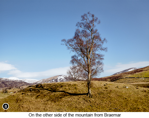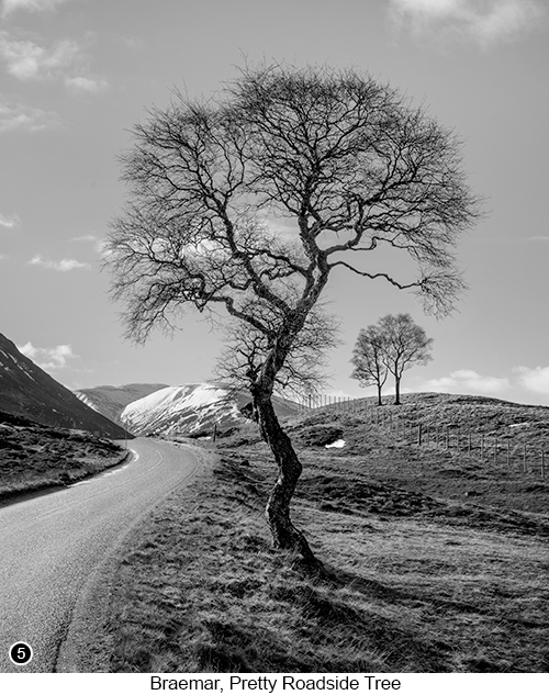 Then back in your vehicle, if you continue to drive further down the road on the other side of the bridge, for about another mile and a half, you will come to a long, old, dilapidated wooden barn structure, standing right at the side of the road. Assuming it is still standing when you are here of course and which I found to be very interesting photographically, as shown in IMAGE 4 to the left. This structure not only looks good set against the snow capped mountains in the background, but also has lots of close up and macro detailed opportunities within it, especially if you are a photographer who enjoys taking close up, grungy, monochrome shots, or broken windows surrounded by rotting wooden frames etc - which pretty much means all of us right? Having taken your shots of the 'Old Empty Barn', get back into your vehicle and retrace your steps, the way you came in and then back over the old stone bridge, to rejoin the main A93 and turn right, so you are now heading further up into the mountains. About another couple of miles further along the A93, as it continues to climb gently into the mountains and heading towards the ski resort at the top of the pass. You will eventually come to sweeping left hand bend, followed by a tighter right hand bend, with parking spaces over on your left and several trees over to your right, behind a wooden fence. You will also see a pretty little tree, with a trunk has been bent into an 'S' shape by the wind, standing right beside the main road, as shown in IMAGE 5, below. I think this is quite a simple yet very effective shot, that should be very easy for you to work with and a good subject, that will allow you to practice your compositional techniques. Because if we look at the shot below and take a minute to analyse it, |