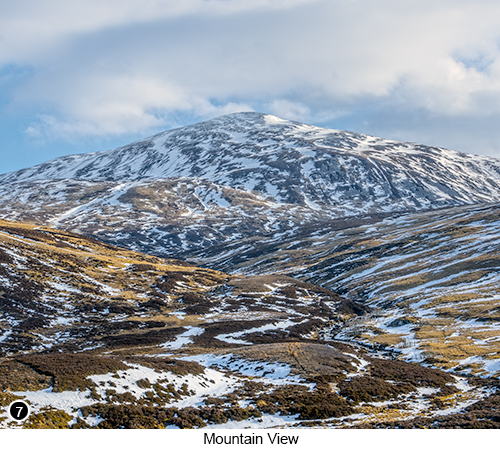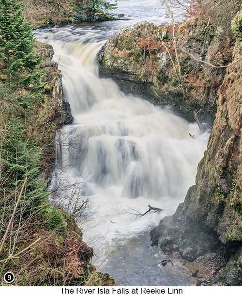 We continued to drive around looking for the Craigisla Bridge over the River Isla, and the Reekie Linn car park, which sits at the side of the Craigisla Bridge, until we eventually located it here, Street View, Map View. Now when we were at the Reekie Linn Falls, it was just after a major 100 mph storms had blown through the week before and so lots of the larger old trees surrounding the falls, had either been uprooted completely, or snapped in half like twigs and so all this carnage meant there wasn't going to be much chance for any worthwhile photography. So the shot your see here on the right in IMAGE 9, is more of a record shot than anything else. But I did want to show you the potential of this place for the future, when I am sure the area around the falls will be tidied up and the damaged trees removed. But none the less, even though it wasn't so good for photography when we were there, I think it is still a really worthwhile waterfall to visit, just to look at the sheer size of it and the amount of water that noisily gushes over it. If you look at the centre right of the shot, you will see the upper part of a tree sticking up out of the water. Then a little further down the falls, you will see where another branch is sticking out of the water. These are both parts of the same full grown tree, so should give you a good sense of how big these falls really are. Tip: All the images shown throughout this chapter, were taken during what I am going to call the 'Scottish Highlands Spring Run Off'. The term 'Spring Run Off' is something I heard to describe the period between late winter and early spring in Canada and North America. Where after the winter snows begin to melt and flow down from the Rockies, all the rivers and waterfalls become swollen and therefore really good for photography. We even spent a few weeks in Canada several years ago at this exact time, just to photograph this phenomenon, which was amazing. But it isn't something that normally happens in the UK, as our winters are not cold enough or snowy enough to create these conditions. However, in the Cairngorms and especially around Braemar, we do get a sort of mini version of the 'Spring Run Off', so that is when I timed our visit to be here, so I could see it and more importantly photograph it. So if you would like to photograph some easily accessible mountains, with the outlines of the melting snow, contrasted across the colour of the heathland down its sides (see image 7). Or you like to photograph lots of gushing waterfalls and overflowing rivers (see image 2), then I would advise that you choose to visit this region in late winter or very early spring. Because to my mind, this is always going to be the best time of year to be here with your camera. I am also fairly confident, that even in summer after a good, long, downpour, there will never be as much water in the rivers and falls as you will find in the spring run off. Also, the mountains without their snow capped peaks in summer, just wouldn't look quite so tall or as interesting in my humble opinion. |