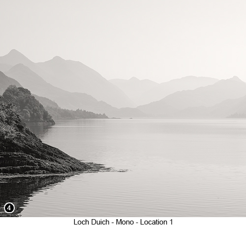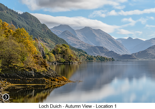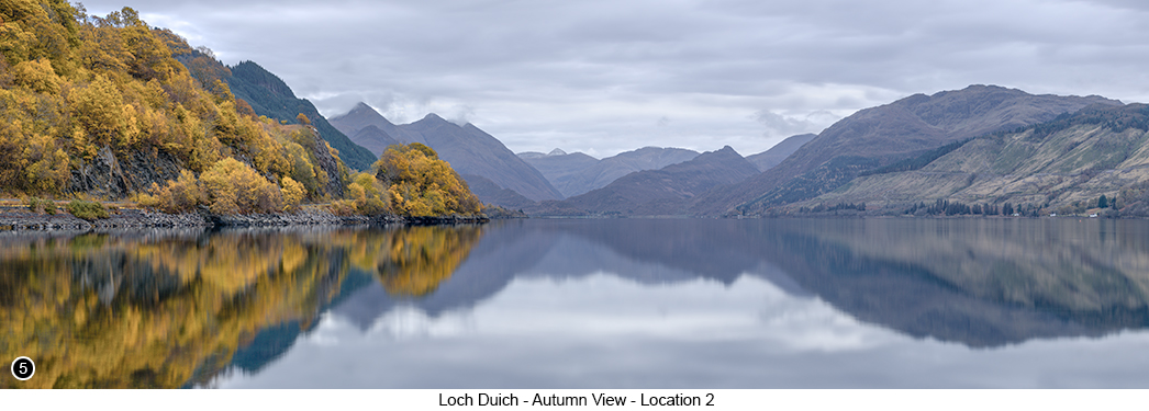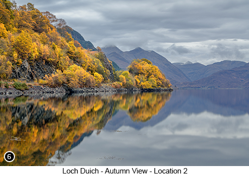 Then once you are safely parked in this second layby, if you look into the trees nearest to the loch on your front right, you will see there is a gap in the trees and an ill defined path down to the edge of the loch. So walk down this path to the shore line and around to the right, for the view shown in SHOT 5 above and SHOT 6 to the right. Tip 1: Best time of year to be here at both of these locations, is in late October or early November for the best autumn colours and especially if we've had some early snow on the peaks. Although winter is also a good time to be here, but the light across the loch in the depths of winter, is quite limited, as the sun soon dips back down behind the mountains on the right side of the loch and throws everything into shadow. Best time of day to be here is around mid to late morning, especially if it happens to be coinciding with a high tide. For the second location, again I suggest you try to be here around mid to late morning, but this time at a three quarter outgoing tide. So if you want to get the best out of both locations on the same visit, try to time it to be here at the highest point of the tide, for the views shown in SHOTS 1 through 4. Then after spending an hour or so working this first part of the scene, the tide will have then receded just far enough, to allow you to easily get down onto the shore, for the second viewpoint. Best conditions to look out for, is obviously a windless day, when the reflections are at their best. But failing that, you could always use your 10 stop ND, to create a long exposure picture, that as 'Gary Gough' refers to it, makes the sea look like an "ice rink". Which is exactly what I did for SHOTS 1 and 3 shown above. |