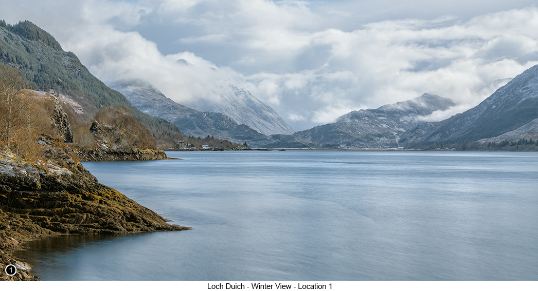 So having got yourself across the road safely and using a lens with a focal range of around 200mm (and a 10 stop filter if the loch isn't already fully reflective), then set up your tripod and camera, looking straight down the loch towards the peaks in the distance. With the Five Sisters mountains range on your left and the low lying peaks of Sgurr Mhic Bharraic and Beinn a' Chaioinich on your right, as shown in SHOTS 1 through 4 above. You will also see that there are a couple of small weed covered mounds along the side of the loch, both in front and behind you. Where if you are willing to fight your way through the trouser ripping brambles and scratch your way up to the top, will give you an even clearer view down the centre of the loch. But if you don't fancy ripping your clothing to shreds as I did, then just stay on the thin strip of grass running alongside the barrier and is where I also took a couple of these shots. The only reason I suggest climbing on top of these small mounds, is that you can then set up your tripod, slightly further out into the loch and thereby frame out, more of the roadside rocks in the lower left foreground. Then once you have finished shooting this scene, as a long exposure pano from left to right and with a few single shots etc, then pack up your gear and walk or perhaps drive, to the next one car layby, which is only about 50 yards further down the A87 to your front right, Street View, Map View, but is probably even more difficult to get into. |