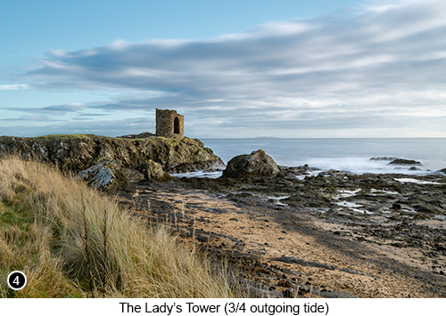 Because I am sure this little lighthouse could look amazing, at both dawn and at sunset. Or perhaps even a night shot, with the stars arcing across the night sky above and with its powerful greenish coloured beam, shining directly out to sea. So having now worked the lighthouse view for all it is worth, if you carry on walking, just a couple of hundred yards further North up the coastal path, with the sea now on your right, a view of which is shown in SHOT 3 above. You will then come to the next location, in this mini photo guide and to the very photogenic, 16th century ruins, of what has now become known locally and historically, as the "Lady's Tower". This semi ruined, single turret styled structure, sits right on the edge of the coastline, in an area called Ruby Bay and is perched directly above some interesting low lying rock structures, as shown at a 3/4 outgoing tide, in SHOT 4 on the right. You will also see there is a grass covered bank that leads down to the rocky beach on your right. So look for a way down to the beach at low tide, via a short but steep, ill defined path. But before I went down this ill defined path, I decided to grab a shot of the scene from the main upper pathway and the view of the tower and the surrounding coastline, as shown in SHOT 4 on the right . The lady in question and for whom the tower was built in the early 1700's, was the Lady (Jenny) Anstruther of the Anstruther family. Which at the time of the tower being built, was by far the the most wealthy and influential family in the county of Fife. |