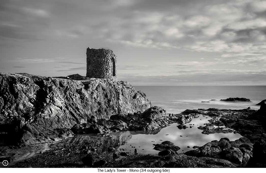 ..and now back to the photo guide. I then walked across the seaweed strewn beach towards the tower, where I found this nice little inlet next to the tower on the right. Where I then setup my camera as low down as I could to the water, to shoot it from there, as shown in SHOT 6 above. The reason I chose to go for this low down shooting position, was to create the effect, of raising the tower up in the frame, to make it look more grandiose and isolated. But at the same time, it also allowed me to place the front element of my lens, within the shadow of the rock to my right, to avoid any chance of flaring. I then setup my composition, with the main weight of the tower, near to an upper compositional third. I then threw on my 10 stop ND and went for a long exposure of 30 seconds. Which I knew would flatten out any of the small waves and ripples, that kept lapping into this tiny inlet from the sea. I then moved around the tiny inlet to my left and setup my tripod for the next shot, on some slightly higher rocks, for a slightly more elevated view. I still had my 10 stop on my wide angle lens, so once again went for a 30 second exposure, as shown in SHOT 5 above. |