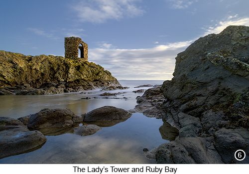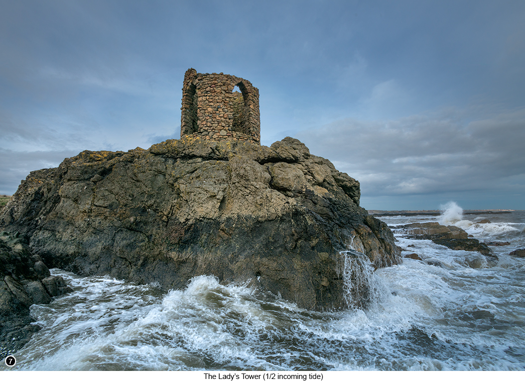 Then on another short visit to this location several weeks later, after reviewing the images I had already taken on my previous trip. I knew I needed to go back on a windy day and shoot the Lady's Tower at a rising mid tide, where the waves would be crashing, around the base of the rocks beneath the tower, as shown in SHOT 7 above. To get to this particular viewpoint, you need to walk down onto the beach and across to the small bay area to the right of the tower. Where you will see a large seven foot high column of rock, standing on the right side of this tiny bay (as can be seen on the middle right of SHOT 4 above). If you then make your way around this rock to the right of it, you will then come out to a large, flattish shelf of rock, that sits a few feet above the incoming waves at half tide and a much more dramatic view of the tower. Now I hope it is doesn't need me to say, that if when you are here, the tide is over 1/2 high and coming in fast. Then to go around this rock in an attempt to get to the above viewpoint, would be quite frankly silly, as well as suicidal. As this flattish area of rock, becomes completely submerged at anything even slightly above a 1/2 incoming tide. So assuming it is half tide and you safely managed to get yourself into this location, as shown above in SHOT 7. Then what I did, was to move in as close as I could, to the channel of water nearest to the front side of the rock and wait for a wave to roll in, as I shot it as wide as I could with my 16-35mm lens. I went for this close but wide method, because I wanted the tower, as well as the rock that it stands on, to look as if they were totally surrounded on all three sides, by the foaming waves of the sea. So even though the channel of water in front of me was quite narrow, the dramatic effect that I could create, by getting really close into it, works very well I think. |