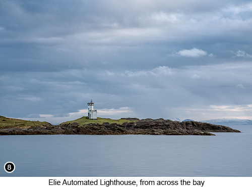 It was decided by the local community of Elie, that the Chair of Refuge (originally known as the "East Vows Beacon") be erected upon the infamous "Vows Rocks" in 1846, due to the mounting number of shipwrecks, that kept occurring on these tidally submerged rocks and with far too many people losing their lives as a consequence. Which I also assume, is why the Vows Rocks were given such a religious sounding name, because of the number of funeral services taking place, in honour of the many shipwrecked sailors, who kept losing their lives here. The Chair of Refuge is made from wrought iron and was designed to stand up to and against, the worst that any weather or storm could throw at it. It also has a caged refuge platform mounted on top of it, that was designed to always remain at least 8 feet, above even the highest of spring tides and be large enough to accommodate upto 10 shipwrecked mariners. One of the iron supports, which you can see towards the bottom right of the beacon in the shot above. Was designed to also act as a ladder, that would allow survivors of a shipwreck, to climb up to safety within the cage and await rescue after the storm had passed and the waves had receded. If you want to get your version of SHOT 9, as shown above, then you are going to need to use a long lens of at least 400mm and a 10 stop ND. Or, you could do as I did and throw a 2x converter onto a 70/200mm zoom. Which I found myself having to do, due to not bringing my 150mm to 600mm along with me, as I didn't think I was going to need it. But even though 400mm was as far as I could go optically, I still felt that I needed to crop into the image even more when I was processing it. That is if wanted to get the final image, to look anything like I wanted it to be when I was shooting it. So what I am saying here is, that the shot you are looking at immediately above, I would guess is equivalent to the framing I could have got, if I had brought my 150-600mm lens with me. However, if I had brought along my 150-600mm, then I wouldn't have been able to use my 10 stop ND filter. As the front element of my 150-600mm lens, is far too big for any 10 stop ND filter that I am currently aware of. So you win some you lose some I guess. When we first drove into the Elie Bay area from the main A917 road, it was the end of the day and the light was sort of flat and uninspiring and there was also a big rain storm brewing on the far horizon and heading towards us. It was about 20 minutes before the sun would be setting, somewhere behind that distant gloom. Yet there was a small hole in the gloom above and a single patch of ocean, being brightly lit to the left of the Chair of Refuge. But unfortunately for me, this patch of light, was way over to the left of the of the scene and nowhere near to the front of the Chair of Refuge, where I wanted it to be. Yet instinctively I knew there was definitely going to be a shot here, if only I could get myself around to the left of the scene and so move the patch of light to the right and in towards the front of the Chair of Refuge. But how could I achieve this? Well in the usual landscape photographer's headless chicken sort of way, I floored the accelerator and drove as fast I legally could (cough), around the bay to the left and then onto the harbour itself and as far as I could down to the end of it (ignoring all the "Official Vehicles ONLY past this point" types of sign, which as we all know, do not apply to landscape photographers in headless chicken mode, only normies). I then leapt out of the car with my gear and scuttled down to the end of the harbour wall and setup my kit, as quickly as I could. To wait breathlessly, with my finger twitching on the remote release, for the pool of light to hove into view. And sure enough, the patch of light continued to slowly move to the right and exactly into the place that I wanted it to be. Where I then hit the release button, to grab a 30 second exposure. Then another. Then another, as the patch of light continued to move to the right, before finally begining to fade and then disappear. What, a, buzz!!! My good wife (God bless her) had stayed with the car, but then moved around to the drivers seat, before driving it back out of the restricted area and into the official car park and paid the £3 parking fees. So that is about all I can tell you, of the many photographic delights you will find, when you are here to shoot, the ridiculously photogenic villages of St Monan's and Elie. |