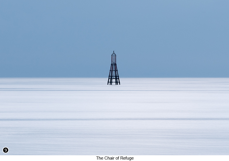 Once you have finished shooting the automated lighthouse and the Lady's Tower. If you go back to your vehicle in the Ruby Bay car park and drive back out the way you came in and back onto the A917. If you then turn left on the A917 and look out for a soon arrived at turning on your left, that leads into the village of Elie. Which has a brown tourist information sign at its entrance, saying Elie Harbour and Public Toilets, Street View, Map View and take this left turn. Now follow this road until you reach the harbour wall and a 'T' junction with Toft Road and take a left. Then drive all the way around the bay, as it arcs away to your right. You will then come to the official Toft road car park at the end of this road, after driving through some blue gates, Street View, Map View. Continue on down Toft road towards the harbour wall, for as far as you can and then into the fee paying car park on your left (it was only £3 when we last visited) and park your vehicle there. You will now have a view back towards the Elie automated lighthouse, from over the car park wall, as shown in SHOT 8 above. But what you will not be able to see, is where I took the shot of the "Chair of Refuge", as shown below in SHOT 9. So to get to the exact location where I took SHOT 9, if you walk towards the harbour offices on your right from the car park and then past the offices and all the way to the harbour wall, Street View and turn right, as you continue to follow the harbour wall all the way to the end. You will find that there is an area at the very end of the harbour, where the harbour wall finishes, about 4 foot before the end of the harbour itself. Which means you will then have an unrestricted view, straight out to sea and the Chair of Refuge itself, sitting near to the horizon. |