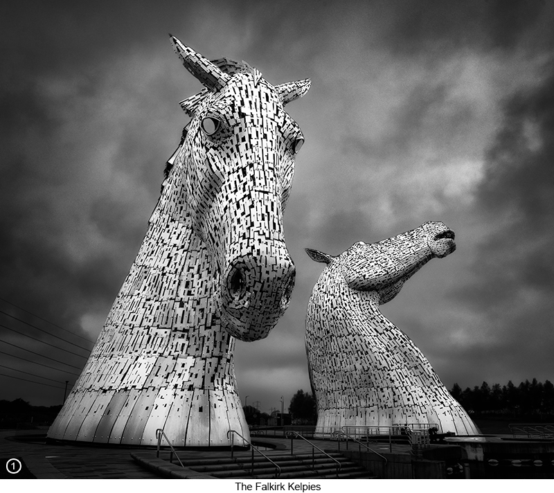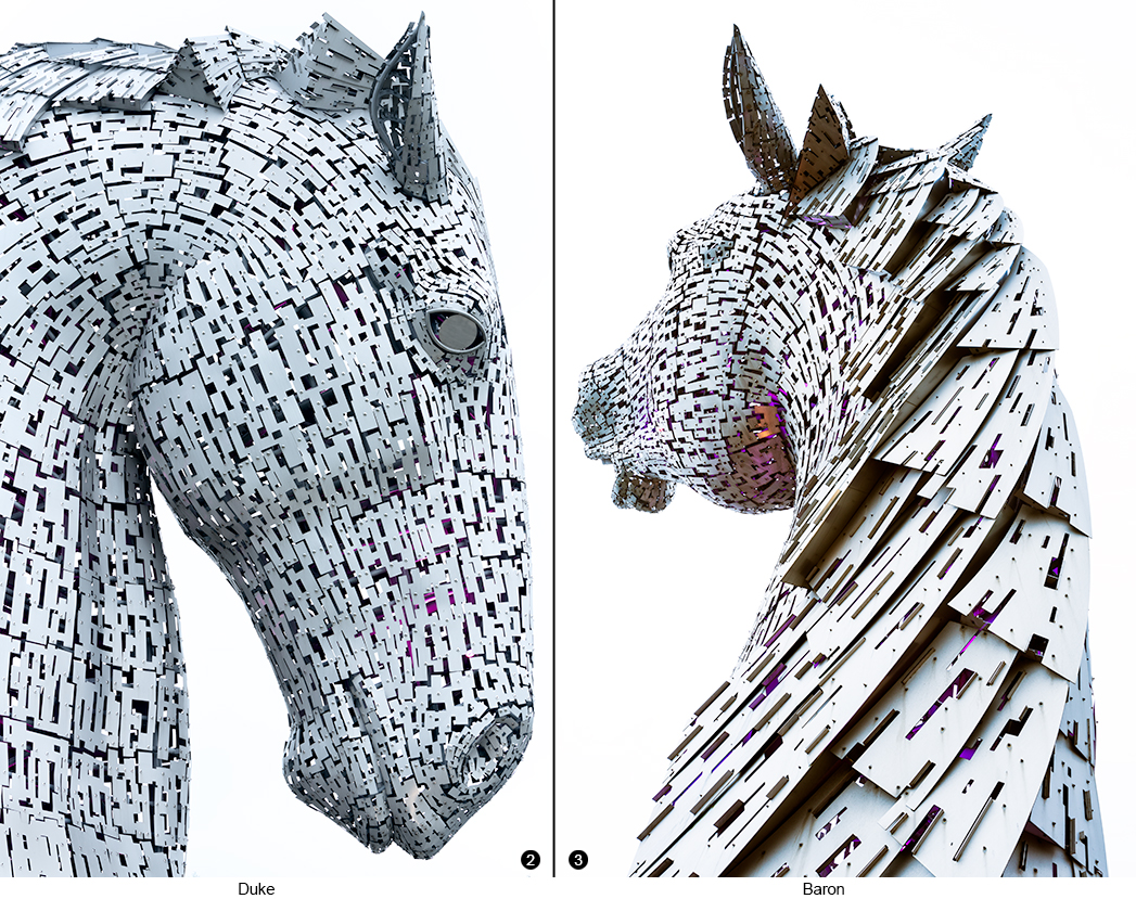 Setting the scene: The Kelpies are two 90 foot high sculptures that depict ancient shape shifting water demons, which were then constructed alongside the new extension to the Forth and Clyde Canal, located between Falkirk and Grangemouth next to the River Carron. The sculptures (and engineering marvels, because this is what they are) were designed by Andrew Scott and were finally completed in October 2013, before then being opened to the public during April 2014. The sculptures form a gateway to the eastern entrance to the Forth and Clyde canal network and are also said to be an historical reference to the horse powered heritage of Scotland and were designed to show, two real life Scottish bred Clydesdale horses called Duke and Baron and who it is said, can still be seen regularly pulling a plough through a farmers field in Pollock. | |