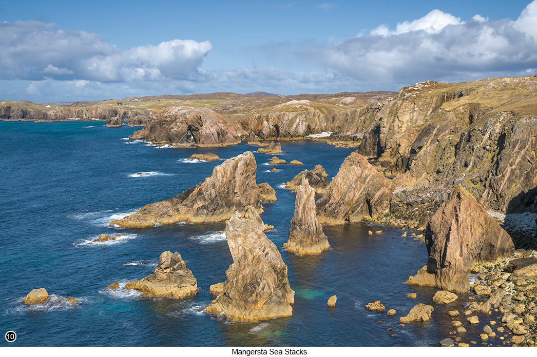 The walk to the sea stacks is easy and flat, so shouldn't be a problem, even if you are carrying a lot of gear. Which you might not need to carry anyway, as you are probably going to be hand holding your camera and using a mid range 24-105 zoom for this shoot. Which focal length range, seems to fit perfectly with the width of the view at this point, as shown in SHOT 10 below. So even though I would suggest that you still take your tripod along with you, as well as a couple of other lenses. Unless you are really lucky, you will find that the strength of the wind, coming over the cliffs tops towards you, is going to be very strong indeed. So shooting hand held, may be your only option here. Although I have seen shots of the Mangersta Sea Stacks, where the stacks are surrounded by calm semi reflective waters. Which does mean that calm conditions and long exposures are possible here. But when we were here, I would guess the winds were easily gusting up into the range, of between 40 to 50 miles per hour. Which made it quite an interesting challenge to work with I can tell you and a very memorable experience for us both. As we spent most of our time on these cliffs, trying to not get blown out to sea. |