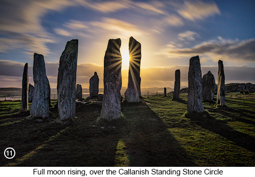 The Callanish Standing Stones, as shown in SHOTS 11 above and 12 below, are known to have been erected on this site around 5,000 years ago, at the end of Neolithic period. Each of these standing stones, are thought to have been selected for their similar shape and size, then erected in a very specific way, that turned them into a permanent solar and lunar calendar. This calendar could be then used by the people who created this structure, to continuously highlight the most significant times of the year, for both ceremonial purposes and farming. Which are thought to have been the summer and winter solstices, as well as the Spring and Autumn equinoxes. This amazingly sophisticated device, has now stood on this site for over 5,000 years and has never changed or been altered through time. Thereby offering us a tantalising glimpse into the distant past, as well as a very atmospheric location to photograph. What is the best time of year, to be here photographing the Stone Circle of Callanish? In my opinion the best time to be here, is outside of the main tourist season in summer, which means any time from early winter through to early spring. But whatever season you do choose to be here, you are still going to have people wandering into your shots. Yet from late October through to late to April, not so many people that they will ruin any chance of getting a clean image of the scene. So even though you are still going to get people walking through the stone circle, you can usually work around them if you have the patience and wait for a lull in the foot traffic. Although this whole area does become a lot less busy after it starts to go dark, especially after the sun has fully set and their smart phones no longer work effectively. Which means you should then have the entire place, pretty much to yourself. But which also means, you will now be shooting it in the dark. But there is a way around that problem and it might just be good enough, to completely blow your socks off..! See below... |