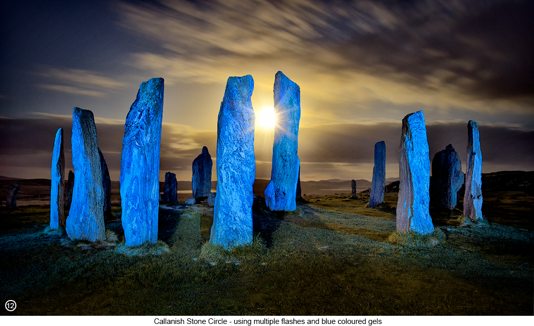 Tip: unless you are really lucky, or you have timed it to be here on a day, when everyone else is doing something more important, such as watching a royal wedding, or the finals of the world cup etc. Then be prepared to stay here working this scene, until everyone has gone home and well beyond the 'blue hour' and into the night. Which if you are a landscape photographer like me, night photography is not something you do very often, or have sufficient practice and skills, to succeed at on your first attempt. So what I advise that you do first, is to watch a seasoned photographer (who you probably already know about), who is willing to show us, how to successfully shoot this type of night scene. And this is where I would like to give a huge shout out to Nick Carver and his youtube videos. Where he explains in great detail, how he took his amazing night shots, of a Saguaro cactus in the Sonoran Desert, by lighting it up using a handheld flash and coloured gels ...and who's idea I totally stole for the shot shown above. Here are the links to the videos of Nick, showing how he worked his night photography magic and in the order that you need to watch them - Sonoran Desert Saguaros part 1, Sonoran Desert Saguaros part 2, Sonoran Desert Saguaros image review. I then used my own variation of Nick's idea, to create SHOT 12 above. But instead of shooting a Saguaro cactus in a desert, I used the idea to shoot the standing stones of Callanish, on a remote Hebridean Island. And I must say, I am very happy with the result. Thanks Nick, your willingness to freely share this information with us all, is very much appreciated! However, being the old curmudgeon that I am, I didn't want to go as high as Nick was willing to go with his ISO settings, because I didn't want to contend with the noise, I knew going above that limit would create. So instead I kept my ISO setting down to 800 and 'light stacked' 3 separate shots back into one. I also knew I would have to do this 'light stacking' technique, because I wouldn't be able to light up the entire width of the stone circle, during one long exposure. Even with multiple firings of the flash and running around like a headless chicken in the dark as Nick did. Which means the shot you see above, is made up of 3 separate shots taken from the exact same viewpoint, but containing nine separate flashes. With 3 flashes being fired off in each of the 3 long exposure shots, as I moved around manually firing the flash, at different points around the stone circle. ..and here's how I did it in more detail. I first made sure that my flash (Canon 580ex) had a fresh set of batteries and then set its beam power to full and with a beam width of 50mm - unfortunately not all flashes have the luxury of allowing you to set its beam width, but this one does. However most non adjustable width beam flashes, will be factory set to around the same 50mm beam width anyway, so it shouldn't be a problem if your flash beam is non adjustable. I then placed two blue coloured gels across the front of the beam and held them in place with a rubber band. I then set up my camera on the tripod and selected the framing I wanted using a torch - you will have to use a tripod for this technique, as your camera cannot move throughout this process. I then set the camera to f/11, ISO 800 and a 30 second exposure, with my 20-105 lens set to 24mm wide. I also used a remote shutter release and set the rear screen of the camera, to preview display mode, so I could see when the 30 second exposure was still firing, as well as when it had ended. I then got my long suffering wife, to stand behind the camera holding the remote and fire it off only when I asked her to. I then walked over to the right side of the stone circle and making sure I was holding the front of the flash, a couple of feet behind the field of view of the lens and pointing it vertically oriented, at around midway up the column of stone furthest to the right. I asked her to hit the release button on the camera, as I fired off my first flash. I then had to wait a few seconds for the flash to power back up again, as I walked a little further around to my left and then fired off a second beam of light and then a third etc., just before the 30 seconds exposure was up. |