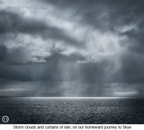 I then waited for the flash to power back up again, as I walked nearer to the front centre of the circle and did the whole process again. We then did it one last time, as I moved around to the left side of the stone circle. I then loaded the 3 separate files into Photoshop, as an aligned layer stack and blended them back into the single image, you now see above in SHOT 12. Explanation of what I mean by the term 'Light Stacking' - When I use the term 'light stacking', what I am describing, is like when you have a scene in front of you, that you know the depth of field is going to be greater, than you can capture in a single shot. So you take several shots at different focal points throughout the scene, to blend back into a single focus stacked image on your computer. Well I did something similar to this, but instead of working with different focal points within the scene, I did it with different areas of the scene I was lighting up with a flash. So that the final image as shown above in SHOT 12, would look like the entire scene was being lit across its full width, as well as from many different angles simultaneously. Although I do realise, how I am now making this 'light stacking' technique, using multiple strobe flashes sound easy, but believe me it isn't. As we had to run through this process at least half a dozen times, before we got it to work in the way that I wanted. But we did get there in the end and which I hope you will agree, really was worth the effort. Then at the end of our amazing week on the Isles of Harris and Lewis, as we returned to the Isle of Skye on the ferry. The bright sunny weather we had just left behind, started to change for the worse. With heavily laden rain clouds, beginning to gather along the Western horizon, as shown in SHOT 13 to the left. But which occasionally had shafts of light, still breaking through the curtains of rain. And, as I was already out on the upper deck, with my 70/200 mounted on the camera, just in case anything turned up - with luck always favouring the prepared etc. I started to shoot the weather and take my final shots of the trip. With SHOT 13, being about the best of the crop. |