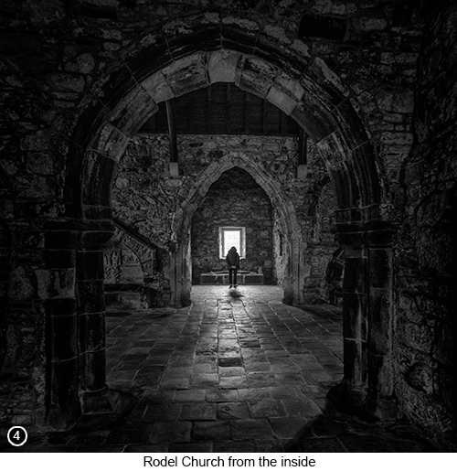 The church grounds are always open throughout the day and where you can walk around to take pictures of it unrestricted. But I found that being so close in to the building, I couldn't get anything from the outside that I liked. So I went inside the church to photograph it from in there, as shown in SHOT 4 below. You will find that it is very dark in the old church, with only a few small windows to let in the light. Hence why I suggest you take your tripod and cable release with you, as you are probably going to be making exposures, several seconds in length. You might also need to bracket your shots, especially if it is a bright sunny day and you intend to include any of the small, ornate, stained glass windows in your compositions. However I did handhold my camera, for the black and white shot shown below left, of my wife standing directly in front of a window, as she looks down at an old stone tomb. So yes you can get away with shooting handheld in here, but is very difficult and will probably require you, to spend quite some time on the computer working on the file. As the contrast range you will be working with, is going to be huge. So be prepared to expose for the highlights and then dramatically pull up the shadows. But if you are using a camera with a modern sensor, such as any of the ones Sony produces (and even if your camera wasn't made be Sony, the sensor probably was), then you should be OK and able to get away with such extremes of contrast. I then went back out onto the A859 and continued driving on a little further, until I came to a viewpoint just a couple of hundred yards away, Map view, Street view. Where I could look back and capture the church within its wider environment, using the compressive perspective of my 70/200, as shown in SHOT 5 below. |