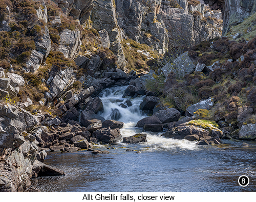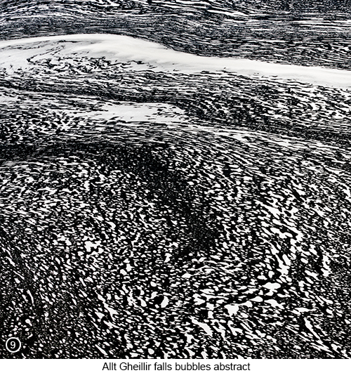 You will also see there is a lightly trodden path that leads down to the falls and a small piece of flat land, that sticks out into the river, as can be seen in SHOT 6 above. So with a medium length zoom mounted on your camera (24-105?). Set off down the path, heading towards the small piece of land that sticks out into the lochan and set up there. As you can see in SHOT 7 above, I went for a cropped pano shot of this scene. As I thought this was probably the best way to show you, all the most interesting features across the full width of the view. I then zoomed into the falls as far as I could, for a more intimate view of it, as shown in SHOT 8 below left. Then having taken my shots of the falls from this particular vantage point, I continued along the path to the left of the lochan, to a slightly higher point overlooking the main pool of water nearest to the falls. Where as soon as I arrived there, I could see directly below me, how there was a long, wide stream of bubbles, moving along with the water the falls were creating and how these bubbles, were making lots of interesting patterns, as shown in SHOT 9 below right . So as soon as I spotted this, I seemed to lose the plot and spend the next thirty minutes or so, shooting lots of waterfall bubble abstracts - yes it really was turning out to be quite an abstract photographic holiday for me wasn't it? |
