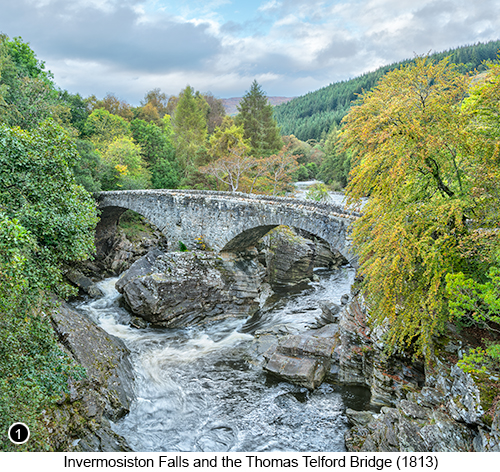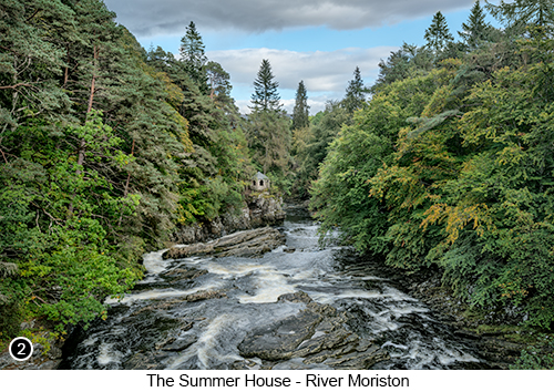 Setting The Scene - The old bridge at Invermoriston was built by Thomas Telford as part of a much larger road and bridge building scheme across Scotland, that aimed to finally and fully open up the Highlands and Islands to ‘Grand Tour’ visitors and businesses alike and which ultimately led to the creation of nearly one thousand miles of new roads, with over 120 stone bridges and which earned Thomas Telford the local tongue-in-cheek nickname of ‘The Colossus of Roads’. The old bridge that crosses over the River Moriston Falls as shown here on the left in image ONE, was built in 1813 and originally formed part of the only carriage accessible route between Drumnadrochit and Fort Augustus, until it was eventually superceded in the 1930s by a much wider concrete bridge and is where you can now stand to take your shots of the old bridge and the River Moriston Falls. The River Moriston and the River Moriston Falls, are easy to find being situated only a couple of miles from the head of Loch Ness on the main A82 road and is where you will also find the tiny village of Invermoriston with its scattering of houses supported by a couple of shops and a restaurant. The name “Invermoriston” is derived from adding the Gaelic word of “Inver” meaning the mouth of a river, to the name of the village, so as this village is situated at the mouth of the River Moriston, it is called Invermoriston. There is also an old Summer House that sits beside the River Moriston on the opposite side to the old bridge from the new bridge, as shown in image TWO below and which was constructed as a Folly during the Victorian era by the Laird of Glenmoriston. He had the Summer House built here perched right on the edge of the lower part of the falls, so he could then impress his house guests, by having their afternoon tea served to them as they watched the wild salmon, leaping their way upstream to their spawning grounds during the annual autumn migration. There are also plenty of enjoyable walks and hikes around Invermoriston, with the most scenic being the one that goes all the way up to the top of the hill that sits directly behind the village (called Sròn Na Muic, which translates from Gaelic as "The Nose of the Pig"), which starts in the village, as shown here in this Hikers Guide for the area. |