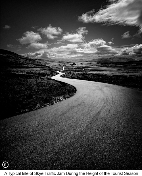 though it took me a while to realise it, I would now argue that the 250 or so mountains of 3,000 foot and above that we have across Scotland, are in a sort of "Goldilocks Zone", whereby it's up to us to make them appear to be whatever size that we want them to be. Myth 5 - Scotland becomes totally full with tourist during summer - I first heard this one only a couple of years ago, so it's quite a late entry onto my growing list of Scottish Photography myths, but none the less it has quickly grown into a really big one and also one that seems to have been swallowed hook line and sinker by the entire world's media and which it then feels compelled to regurgitated every summer like clockwork. But I think this one started after a well known South of England newspaper, decided to cobble together a few stock pictures of the summer traffic jams that can sometimes happen up here, just to fill a few column inches and which then screamed something like: SCOTLAND IS FULL, SO DON'T EVEN THINK ABOUT GOING THERE FOR YOUR HOLIDAY!!!! But who knows what their motives really were and so yet again all I can tell you based on the fact that I actually live here, is that this is yet another myth that simply isn't true. Now there are occasions when a road can become blocked by a camper van, that has sunk into a ditch after being driven by someone who doesn't know how to negotiate their way around the many single track roads we have up here, using the passing places provided (as shown on the left - street view - map view). Or it could perhaps have been due to the traffic queues that can quickly form behind a certain type of first time visitor, who for some inexplicable reason thinks that because they are on holiday, it is perfectly OK for them to screech to a halt in the middle of an unrestricted speed limited road, without any warning whatsoever and then nonchalantly get out and start taking shots of the scenery with their smart phones, as any unfortunate locals or delivery trucks etc following on behind them and just trying to get to work, also have to stamp on their brakes to avoid crashing into them, as they continue to shoot the scenery totally oblivious to the utter carnage and mayhem they are causing all around them! Now there could also be other reasons why this myth continues and which is probably more to do with the fact that Scotland is a very sparsely inhabited region, with only 8% of the UK population living here, but spread across almost half its length. Which can mean that in some of the more remote outer regions of Scotland, a village that looks to be of a good size on the map, turns out to have only 3 or 4 houses in it. So finding somewhere to stay can be a little tricky at times, but only if you haven't taken the time to book ahead. But all I can tell you as someone who actually lives here, is that even in the height of the summer holiday season, I know that I can walk out of my front door and within a ten minute drive be standing on a beach, that even though it runs alongside the main road into Skye, it still has more than enough amazing views to keep me happy for many hours and that I will also probably have it all to myself (as shown below- street view - map view). |